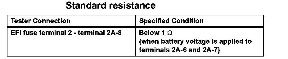 1. Remove the EFI fuse. Using an ohmmeter, measure the resistance between the terminals.