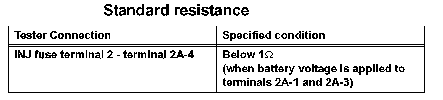 1. Remove the INJ fuse. Using an ohmmeter, measure the resistance between the terminals.