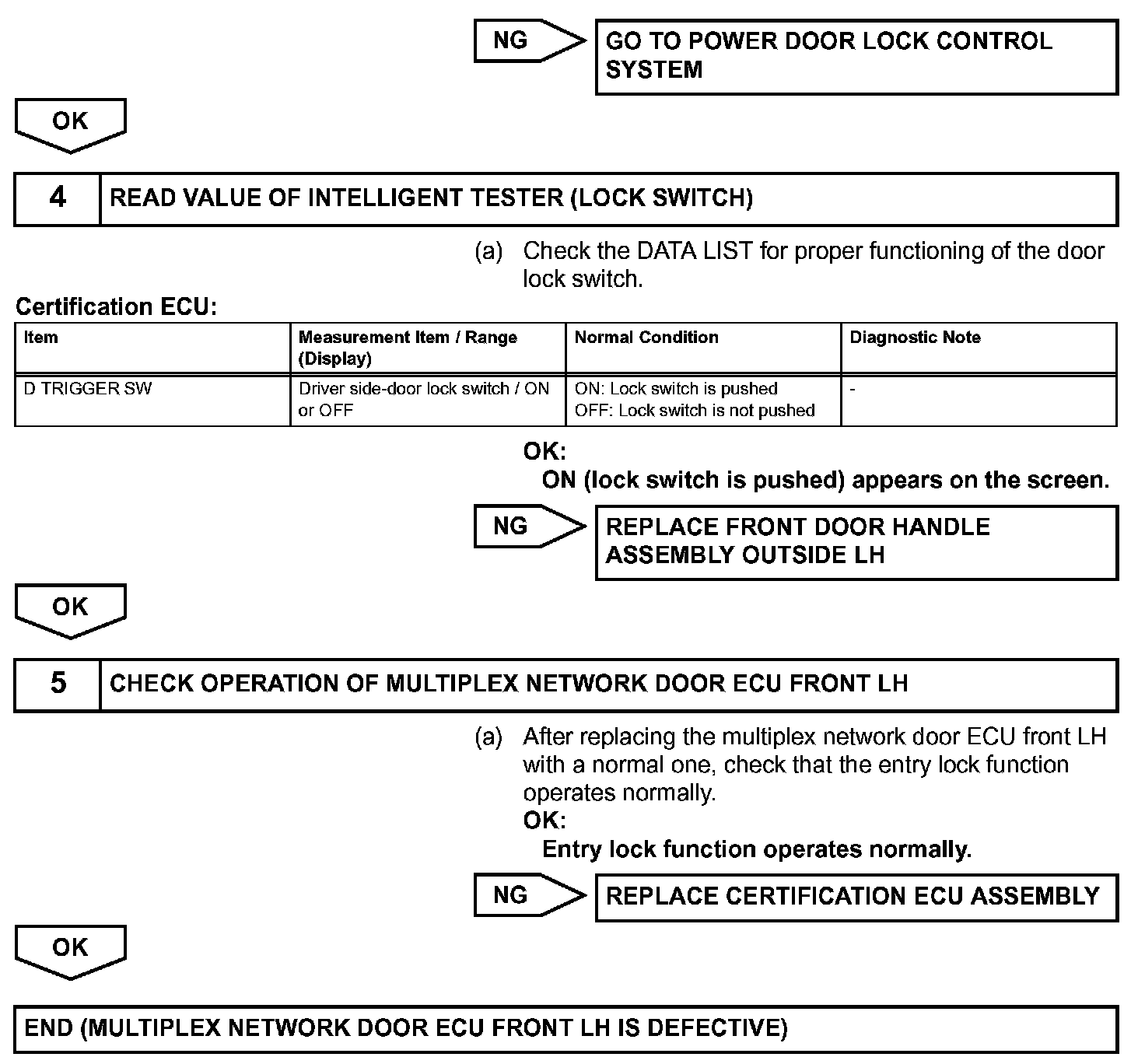 When the touch sensor inside the outside door handle front LH is touched, the multiplex network door ECU front LH (driver door ECU) sends a request signal to the door electrical key oscillator front LH. The key receives this request and transmits its ID code. Upon receiving the ID code, the certification ECU determines that the key is outside the vehicle and sends a lock signal to the driver side door lock through the cowl side junction block RH (multiplex network body ECU).