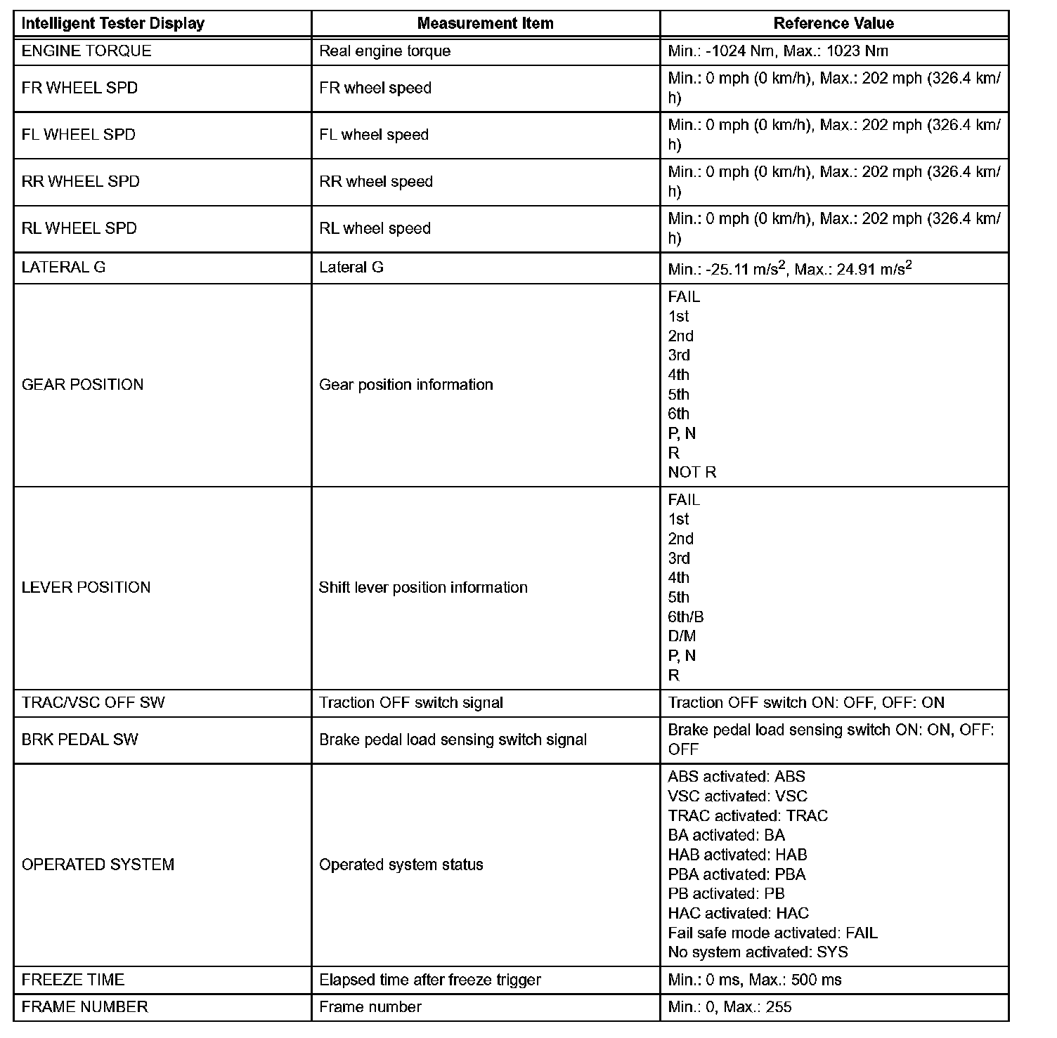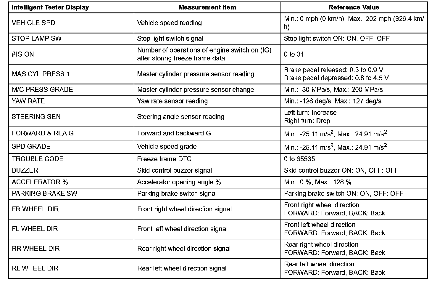 ^ Freeze frame data at the time a DTC is detected: When the skid control ECU stores data at the time a DTC is detected, no updates will be performed until the data is cleared.