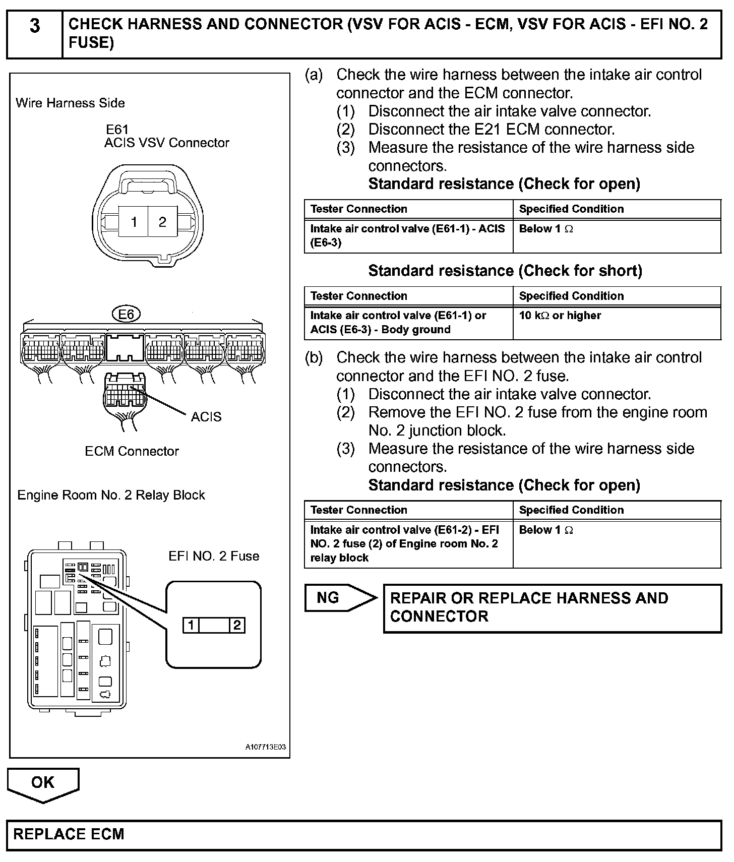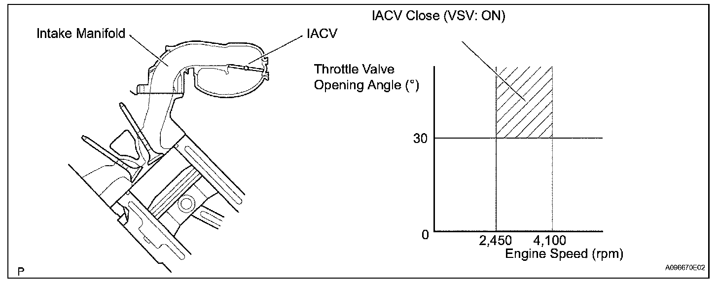When the Intake Air Control Valve (IACV) opens and closes, the ACIS control circuit causes the engine load intake efficiency to increase. When the engine is running at 2,450 to 4,100 rpm and the throttle valve opening angle is 30 degrees or more, current flows through the ACIS control circuit and the IACV closes. For all other situations, current does not flow through the ECM and the IACV is open.