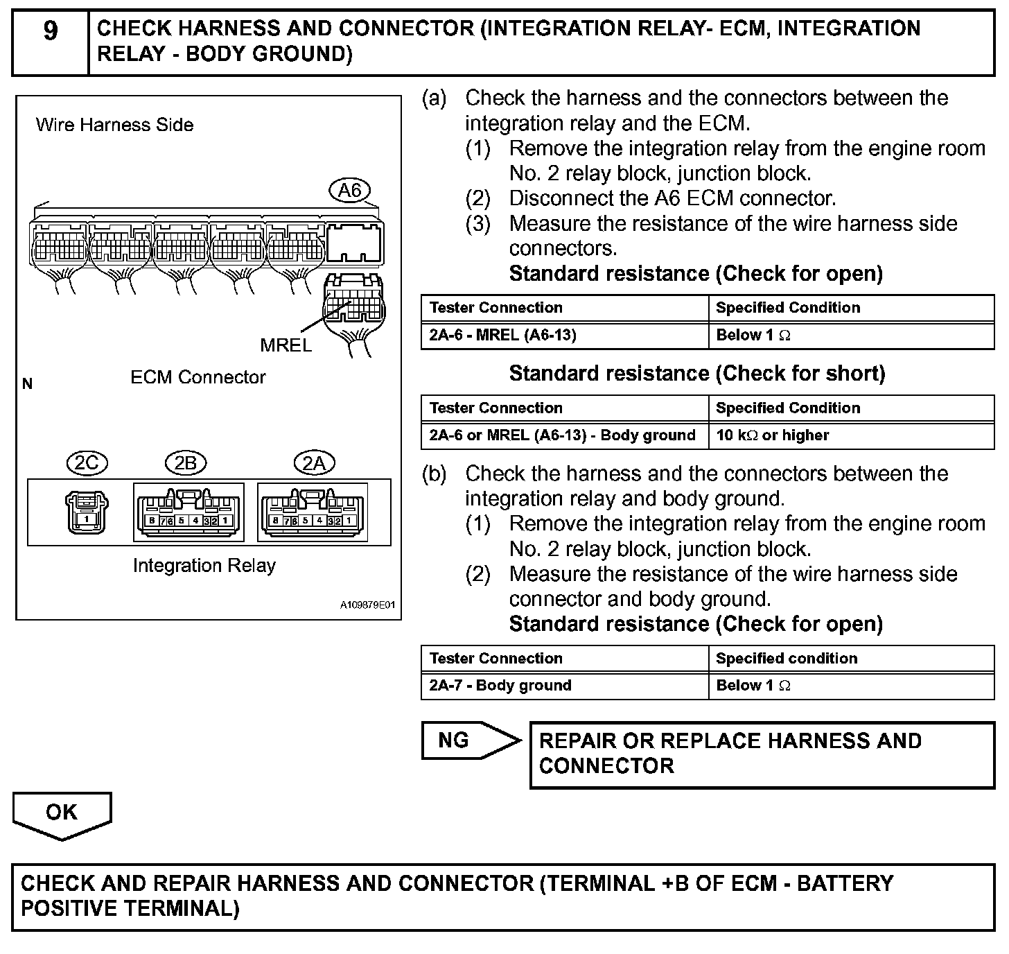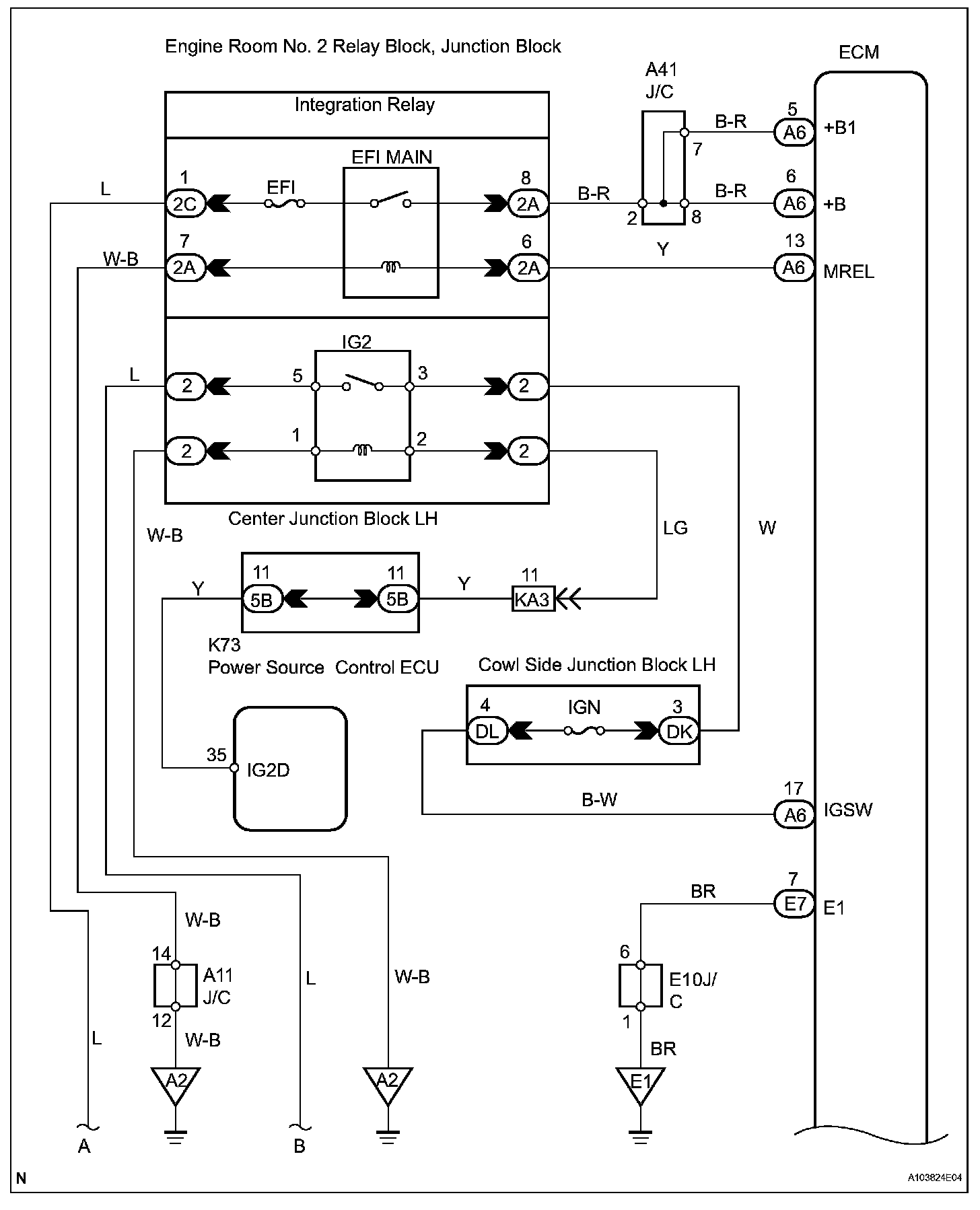 When the engine switch is turned on (IG), voltage from the ECM's MREL terminal flows to the integration relay (EFI MAIN relay). This causes the contacts of the integration relay (EFI MAIN relay) to close, which supplies power to terminal +B or +B1 of the ECM.