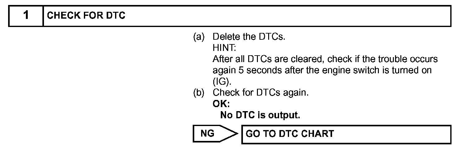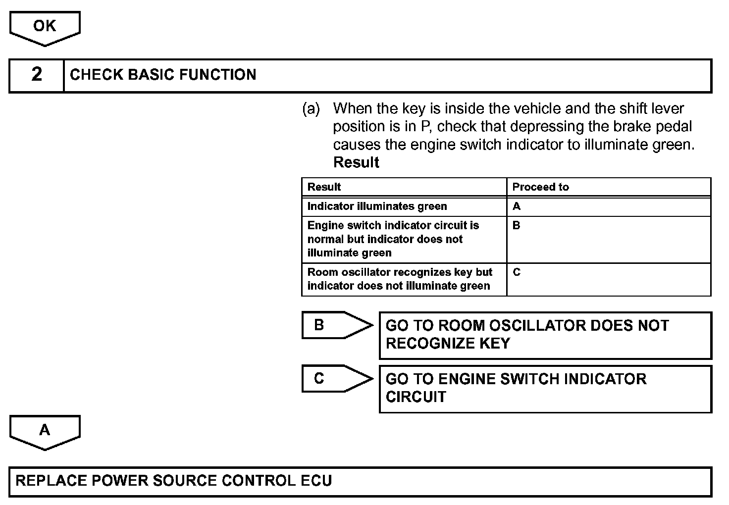If the certification ECU detects the key inside the vehicle when the shift lever position is P and the brake pedal is not depressed, each press of the engine switch changes the power source mode in the order: off, on (ACC), on (IG), off. If one of the DTCs shown in the illustration is detected, correct the DTCs according to the DTC chart. If the power source mode is still malfunctioning, one of the following may have occurred: 1) the MPX circuit has a malfunction, 2)the certification ECU has determined that the key is not inside the vehicle, 3) the engine switch has a malfunction, or 4) the power source control ECU has a malfunction.