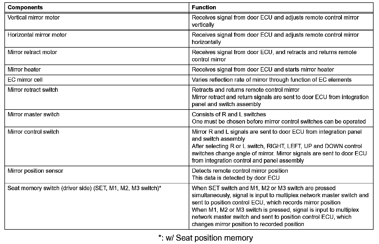 This system has the given functions: automatic glare resistant electrochromic (EC) mirror, reverse shift-linked mirror, electrical remote control type mirror, memory function, and rear window defogger-linked mirror heater.