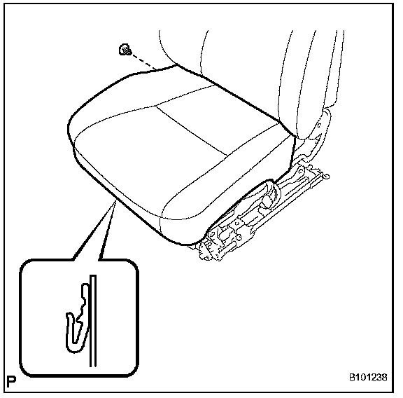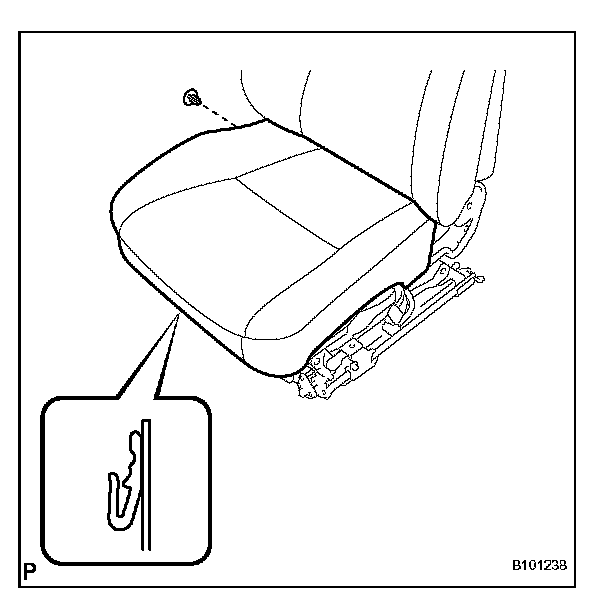 d. Using a screwdriver, detach the hooks and remove the front seat cushion cover with pad.