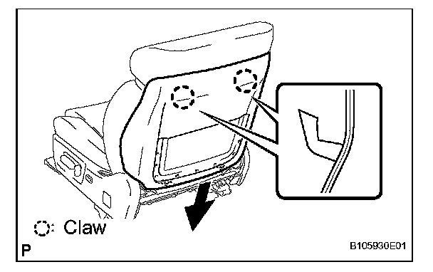 b. Pull the seatback board in the direction indicated by the arrow in the illustration to detach the 2 claws. Then, remove the seatback board.