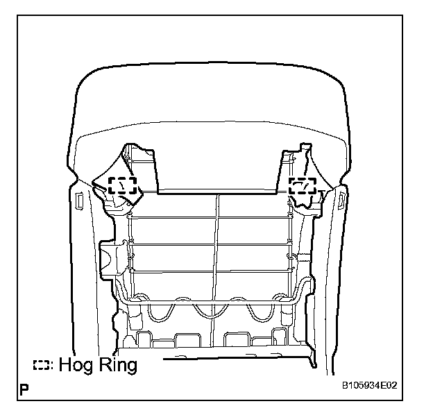 e. Using hog ring pliers, install the seatback cover (with pad) to the seat frame with new hog rings, and attach the hooks.