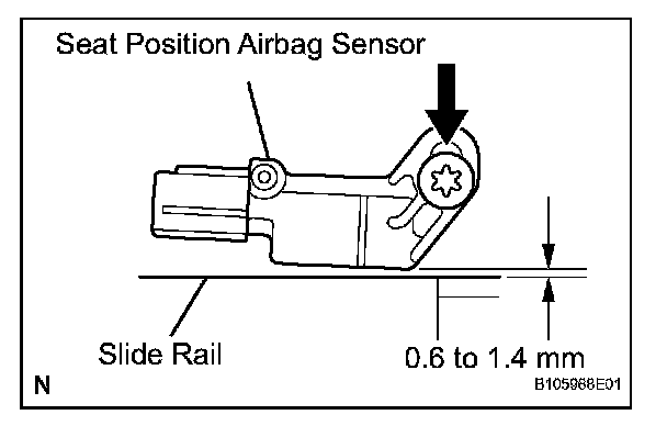 HINT: Make sure that the clearance between the seat position airbag sensor and the slide rail is within 0.6 to 1.4 mm (0.023 to 0.055 in.).