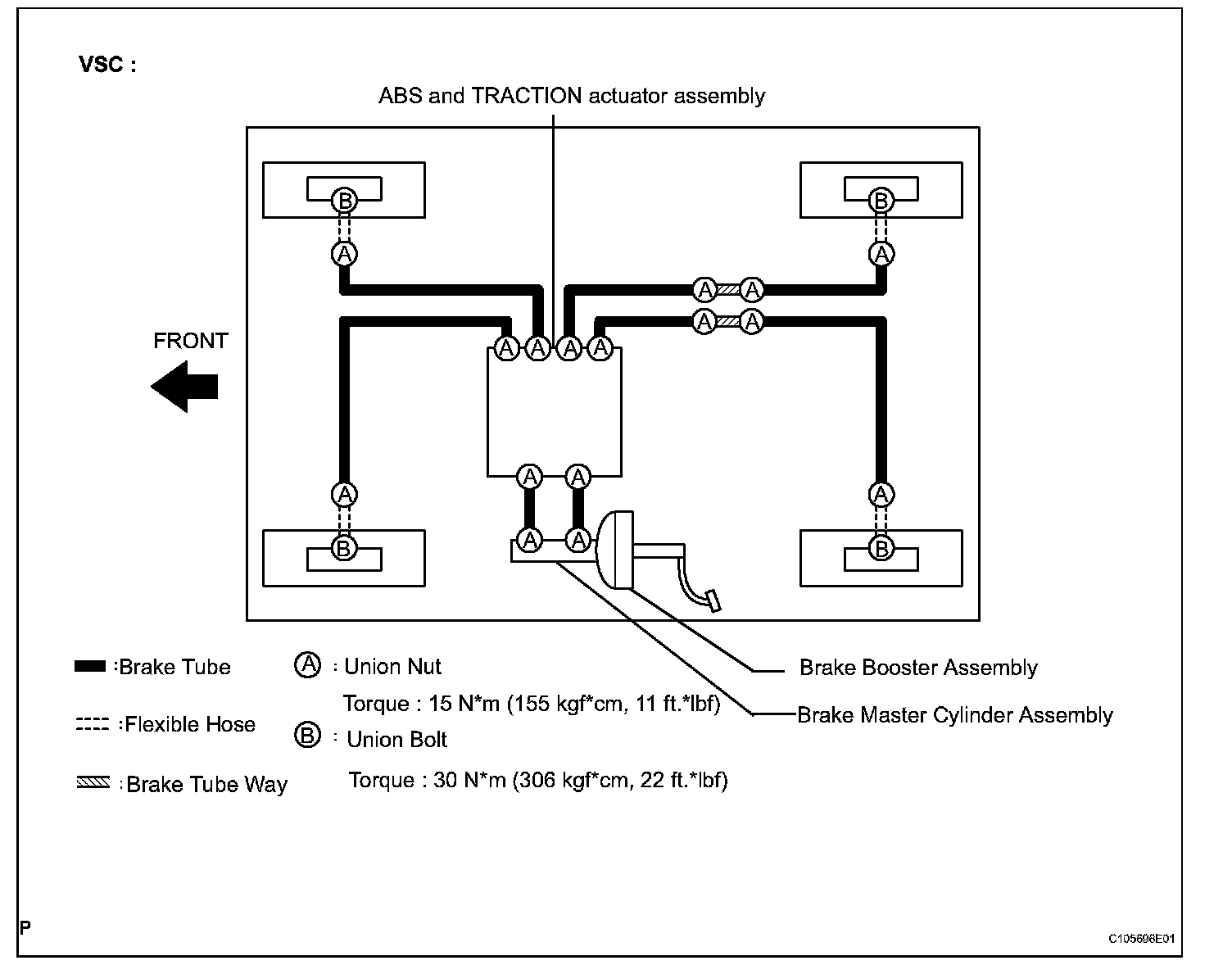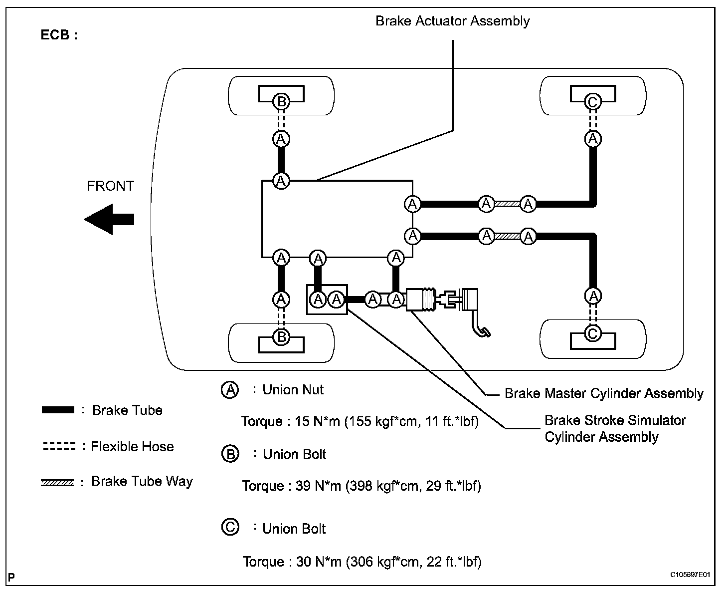 See the layout drawing to confirm the locations and tightening torque of flexible hoses and brake tubes.