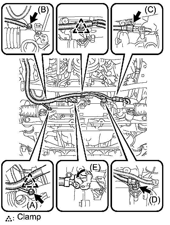 b. Connect wire harness connector (E) to the power steering link and securely lock the connector.