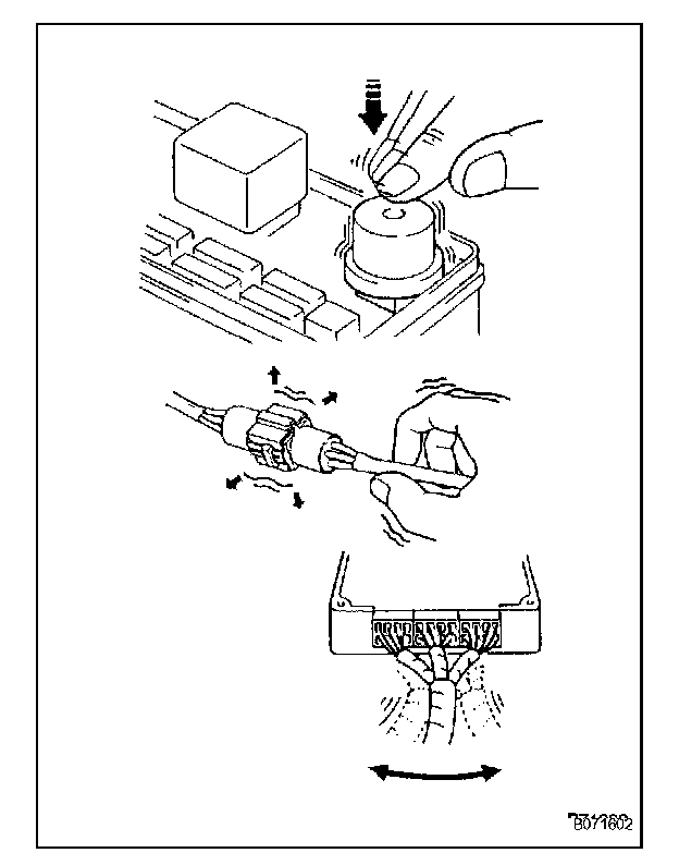 With a problem that only occurs when the engine is cold or as a result of vibration caused by the road during driving, the problem can never be determined if the symptoms are being checked on a stationary vehicle or on a vehicle with a warmed-up engine. Vibration, heat or water penetration (moisture) is difficult to reproduce. The symptom simulation tests below are effective substitutes for the conditions and can be applied on a stationary vehicle. Important points in the symptom simulation test: In the symptom simulation test, the problem symptoms as well as the problem area or parts must be confirmed. First, narrow down the possible problem circuits according to the symptoms. Then, connect the tester and carry out the symptom simulation test, judging whether the circuit being tested is defective or normal. Also, confirm the problem symptoms at the same time. Refer to the problem symptoms table for each system to narrow down the possible causes.