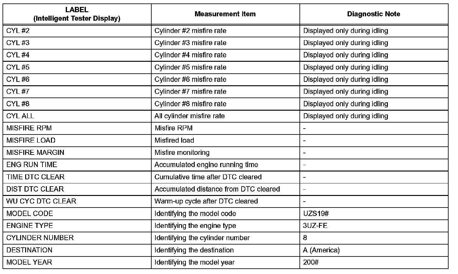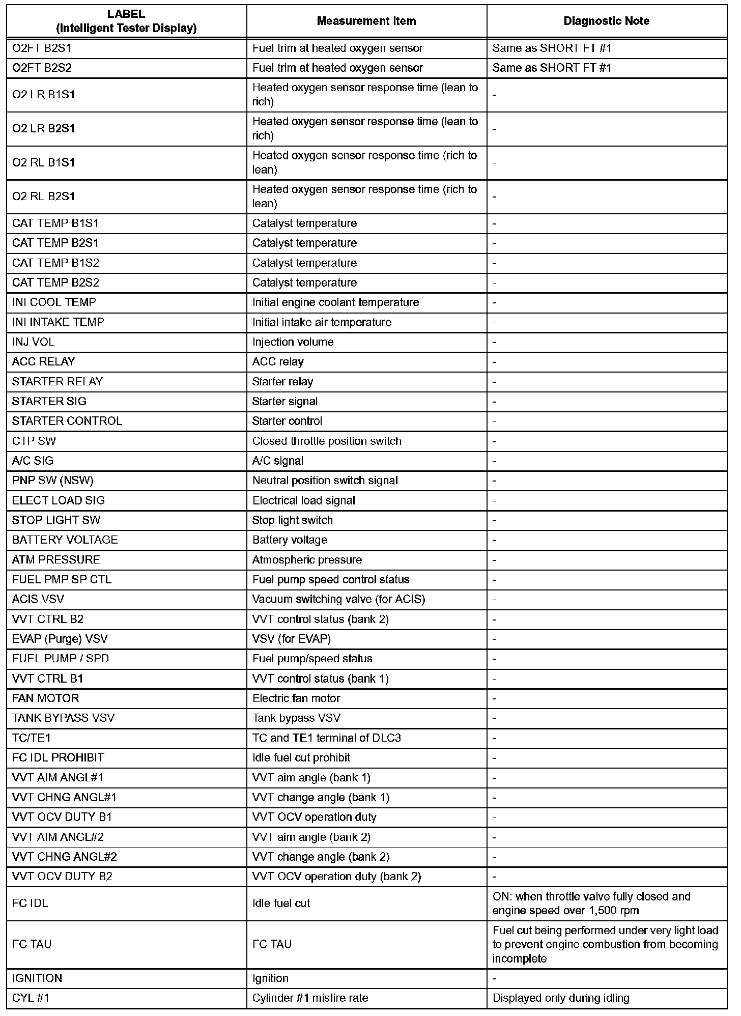 Freeze frame data records the engine conditions (fuel system, calculated load, engine coolant temperature, fuel trim, engine speed, vehicle speed, etc.) when a malfunction is detected. When troubleshooting, freeze frame data can help determine if the vehicle was running or stopped, if the engine was warmed up or not, if the air-fuel ratio was Lean or Rich, and other data from the time the malfunction occurred.
