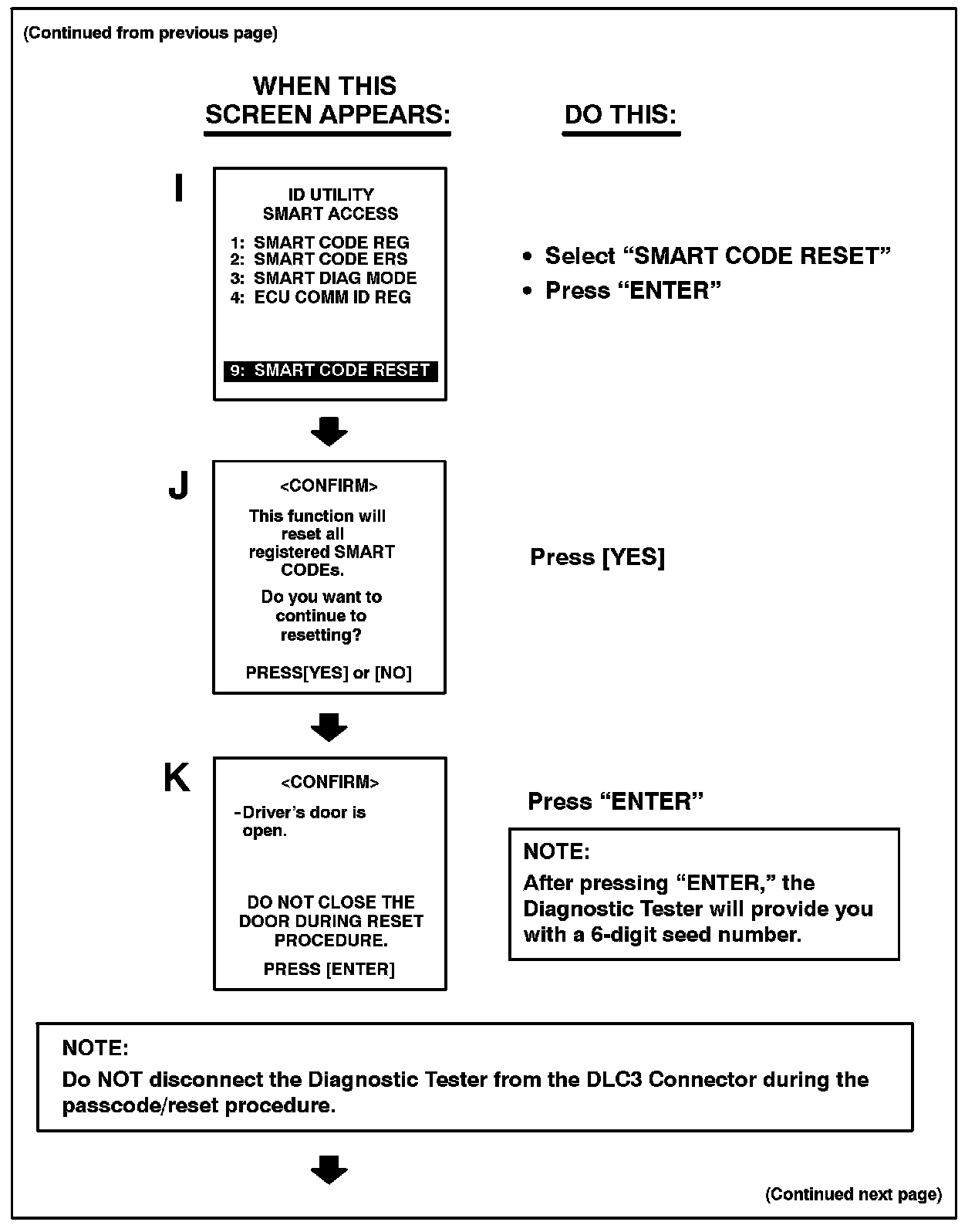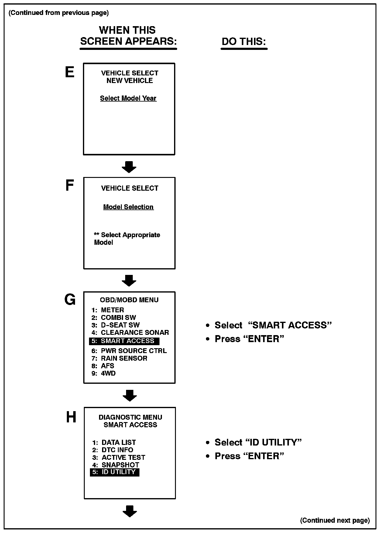 Follow the Diagnostic Tester screen flows. This procedure works best if you use the instructions under the "DO THIS" column and use the screen prints to know WHEN to perform the instructions only.