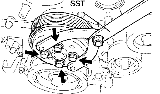 b. Using SST, hold the pulley and tighten the 4 bolts.