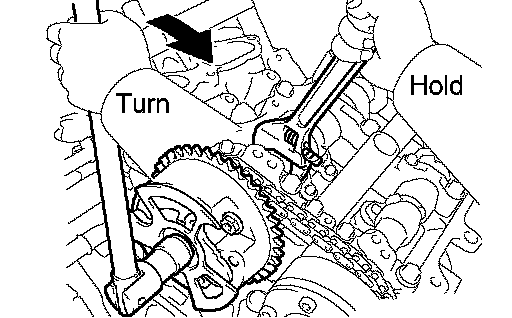 c. Turn the camshaft timing gear assembly on the RH bank counterclockwise to tighten the chain between the banks.