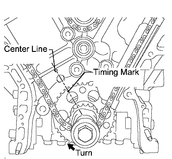 d. Align the mark plate and timing mark as shown in the illustration and install the chain onto the crankshaft timing sprocket.