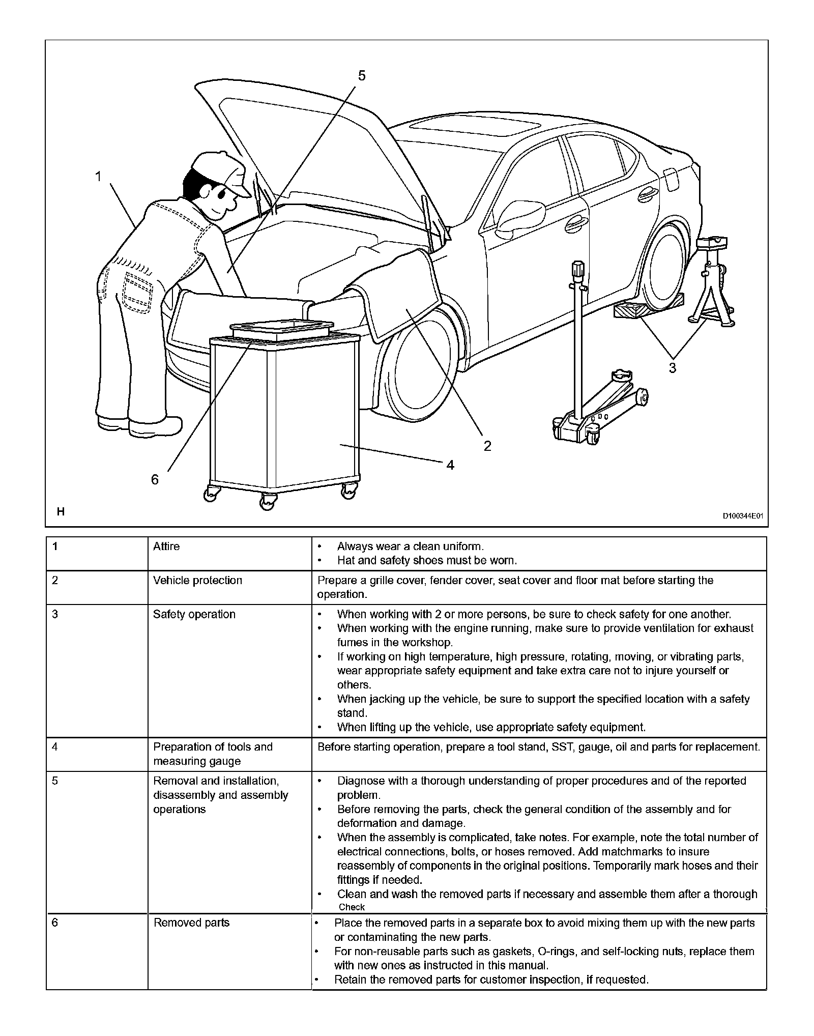 1. Care must be taken when jacking up and supporting the vehicle. Be sure to lift and support the vehicle at the proper locations.
