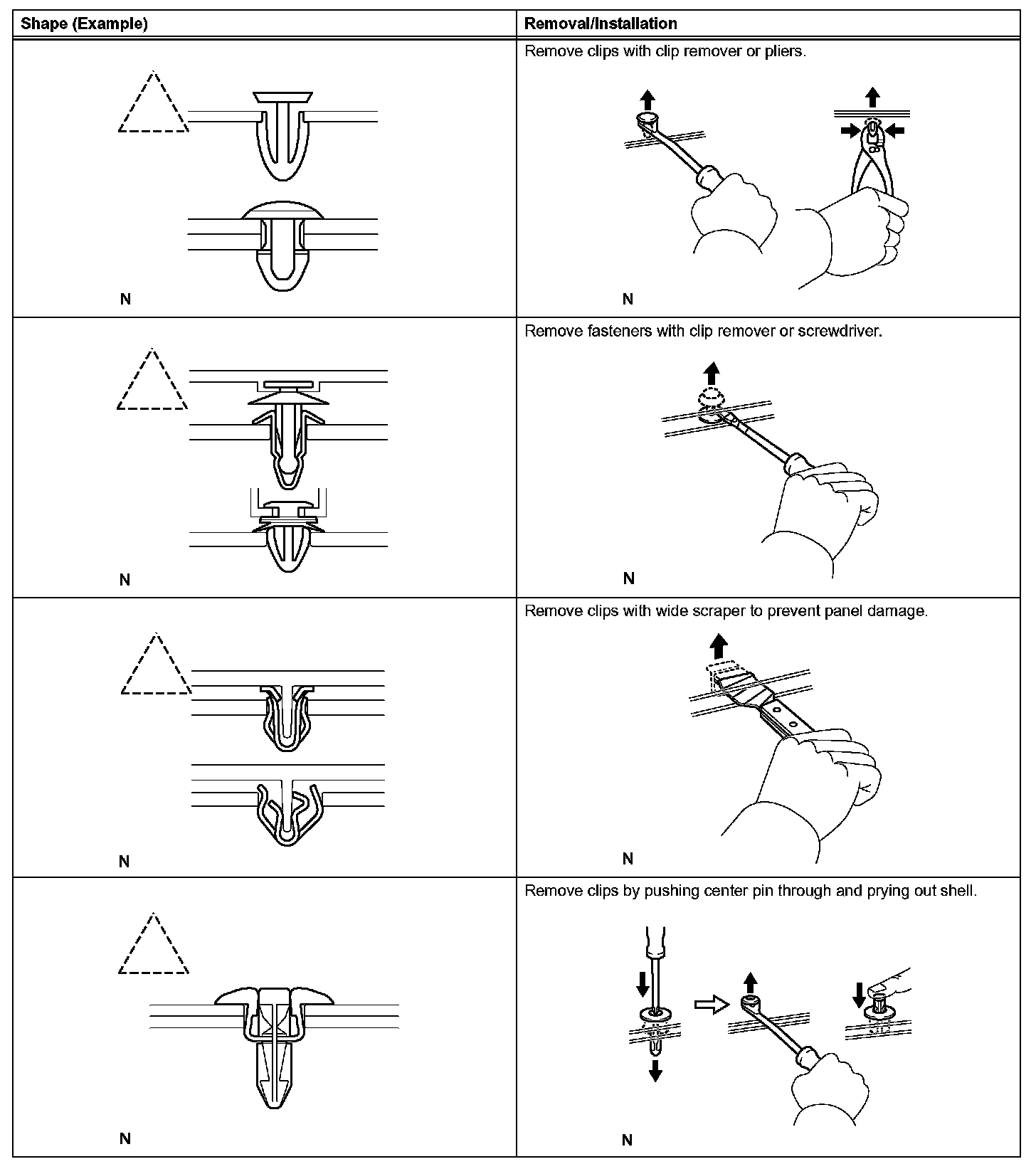 1. The removal and installation methods of typical clips used for vehicle body parts are shown in the table.