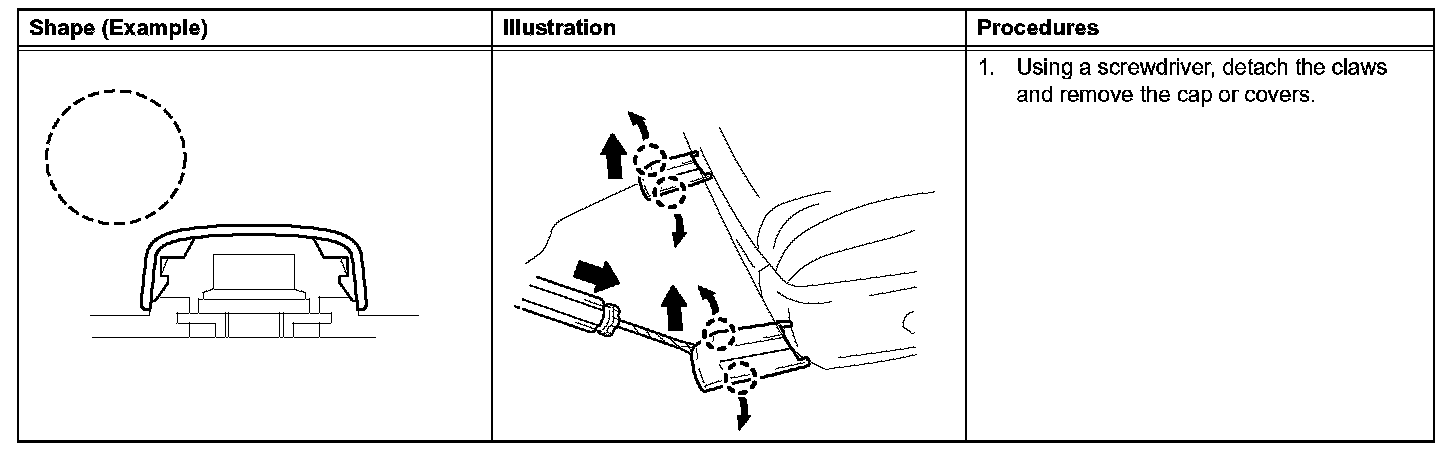 1. The removal and installation methods of typical claws used for vehicle body parts are shown in the table.