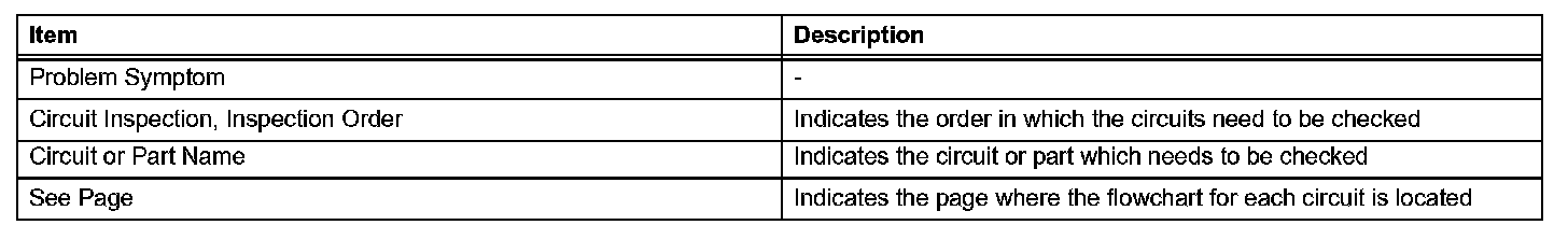 PROBLEM SYMPTOMS TABLEWhen a "Normal" code is output during a DTC check but the problem still occurs, use the Problem Symptoms Table. The suspected areas (circuits or parts) for each problem symptoms are in the table. The suspected areas are listed in order of probability. A description of each of the chart's columns are as mentioned.