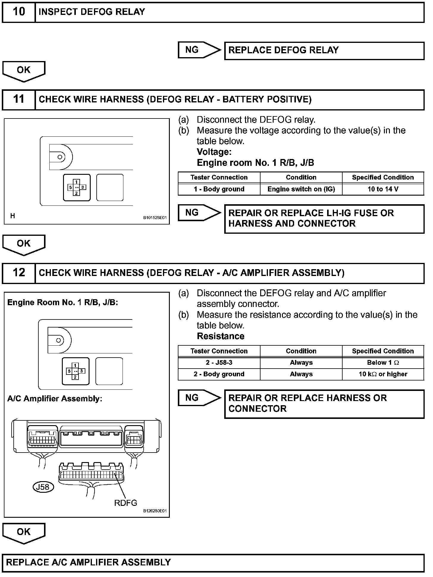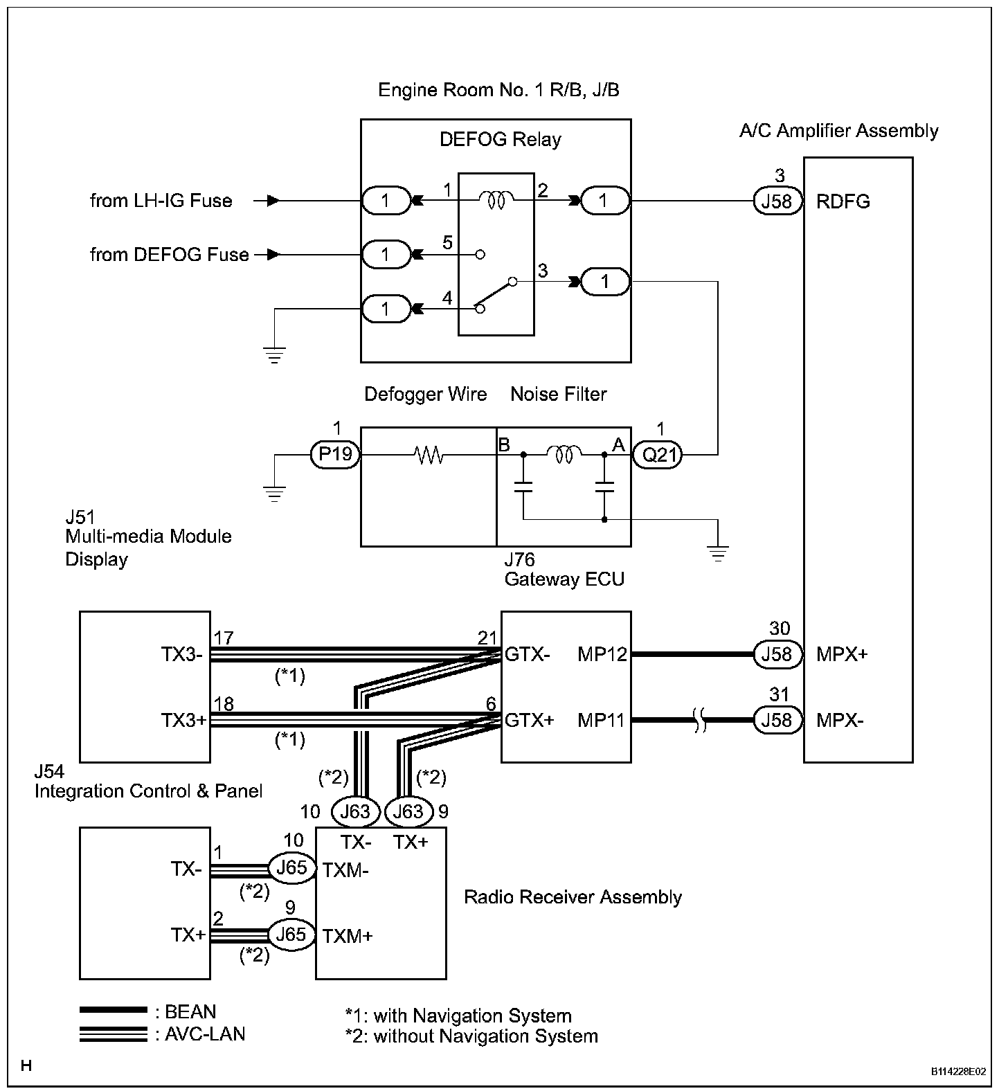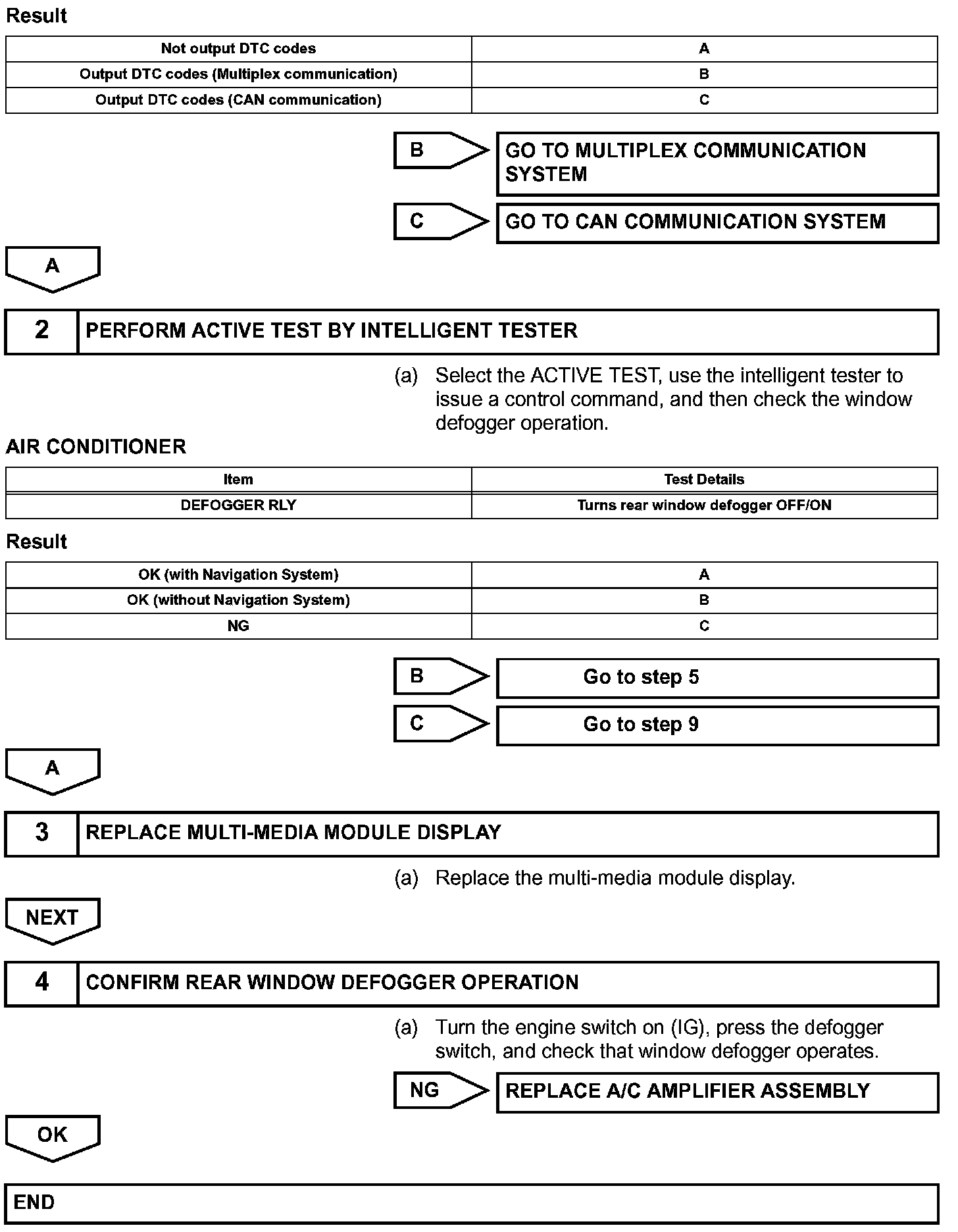 When the rear window defogger switch, which is built into the multi-media module display assembly, is operated, the operation signals are transmitted to the A/C amplifier assembly through AVC-LAN and BEAN. When the A/C amplifier assembly receives the signals, it turns on the DEFOG relay to operate the rear window defogger.