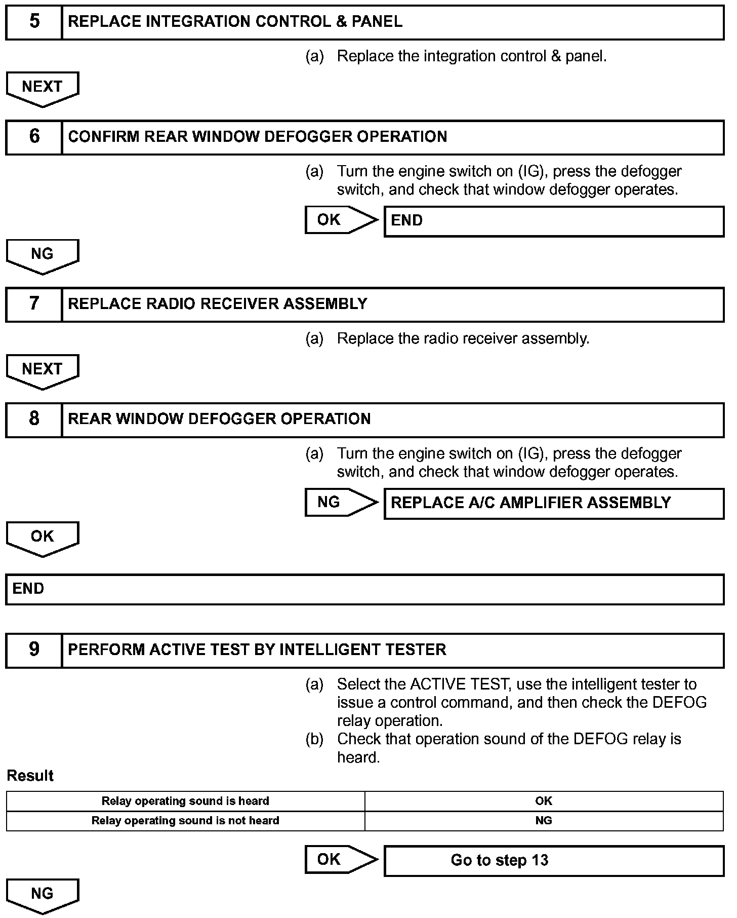 When the rear window defogger switch, which is built into the integration control & panel, is operated, the operation signals are transmitted to the A/C amplifier assembly through AVC-LAN and BEAN. When the A/C amplifier assembly receives the signals, it turns on the DEFOG relay to operate the rear window defogger.