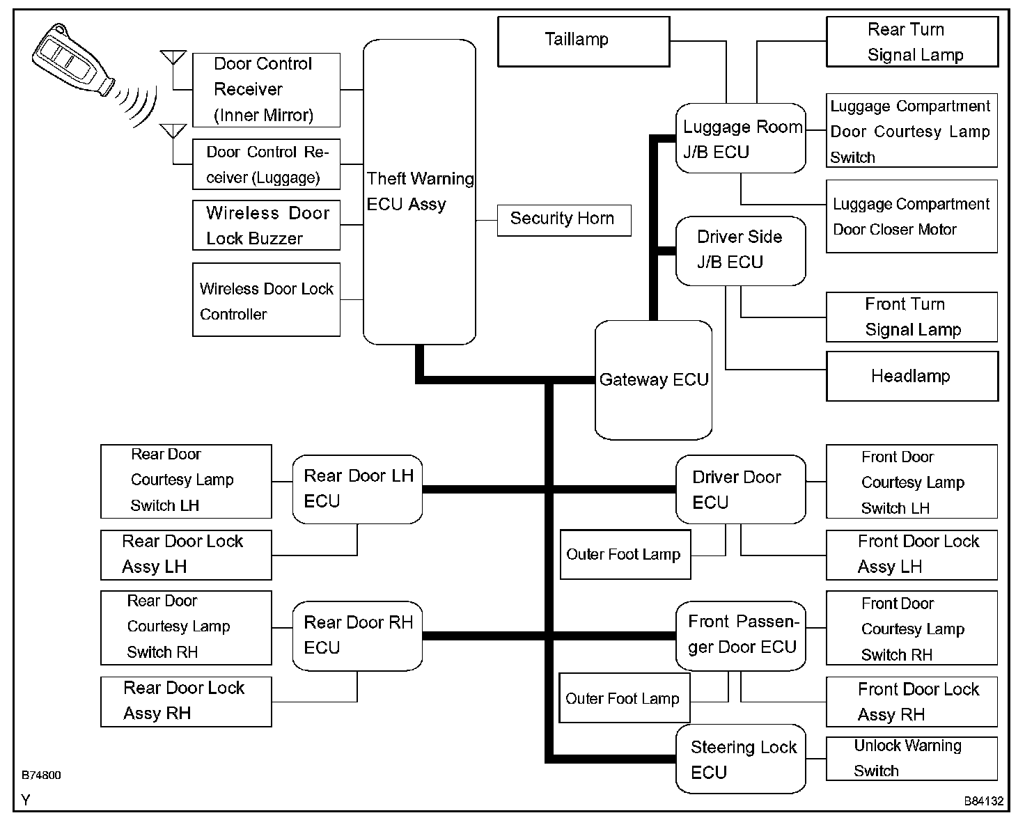1. In this system, the door lock control receiver performs the code identification process and the theft warning ECU (theft deterrent ECU) operates the door lock control. A serial data link is provided for communication between the door control receiver and the theft warning ECU assembly.