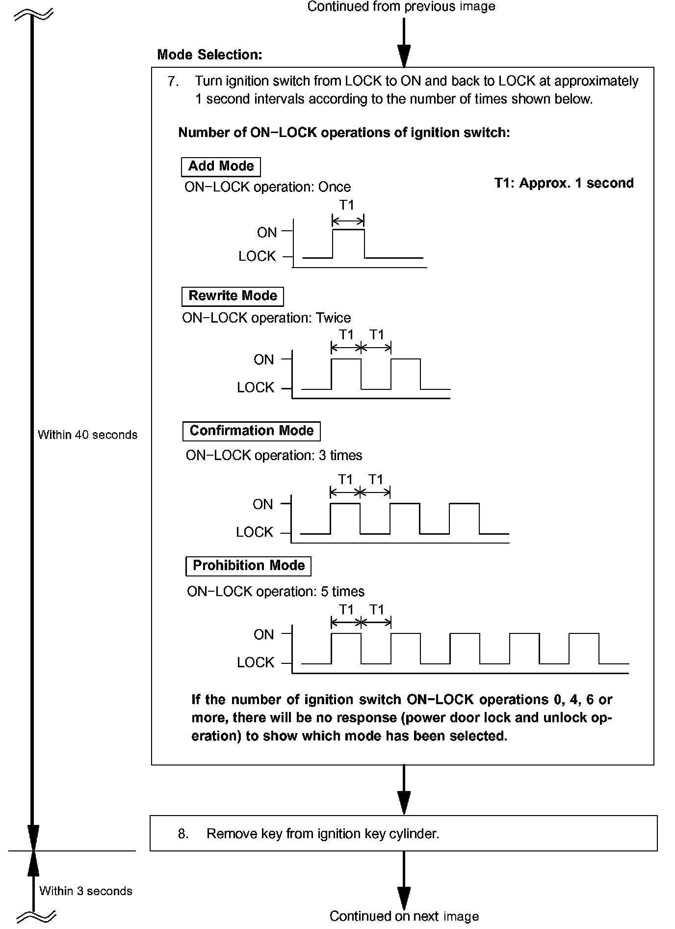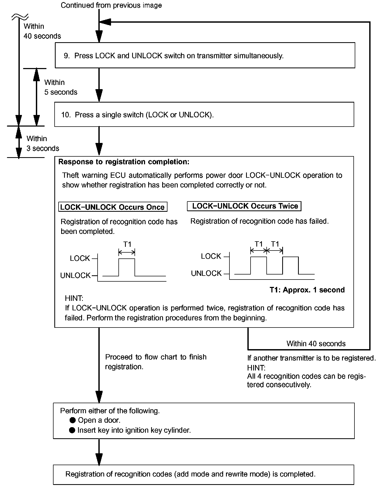 - Add mode is used to register new recognition codes while still retaining codes already registered. This mode is used when a new transmitter is added. If the number of registered codes exceeds 4, the previously registered codes will be erased, starting from the first registered code.