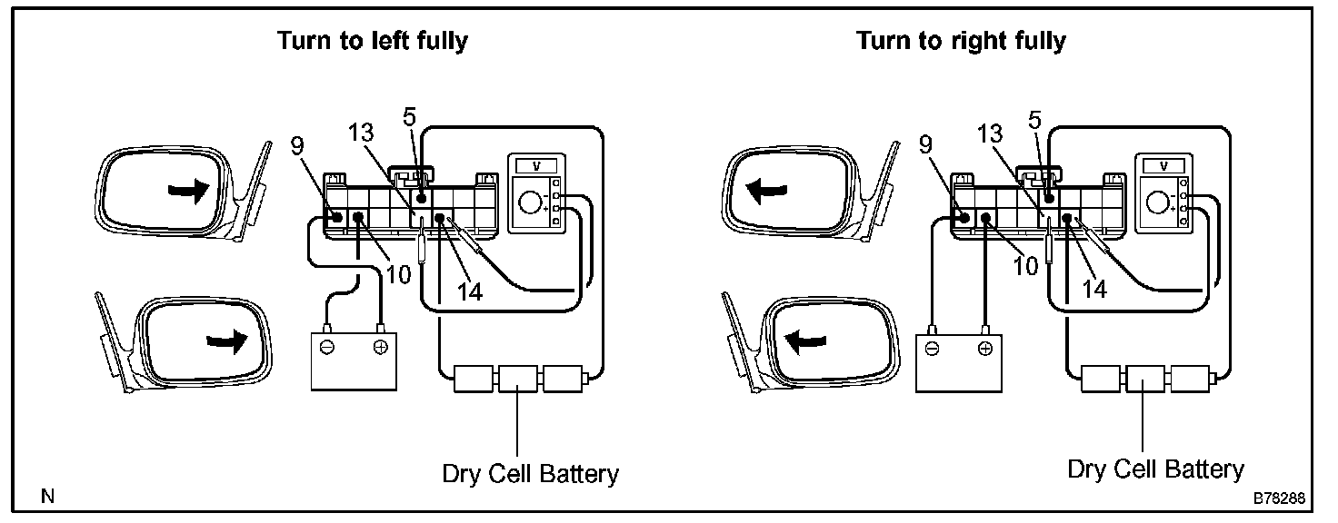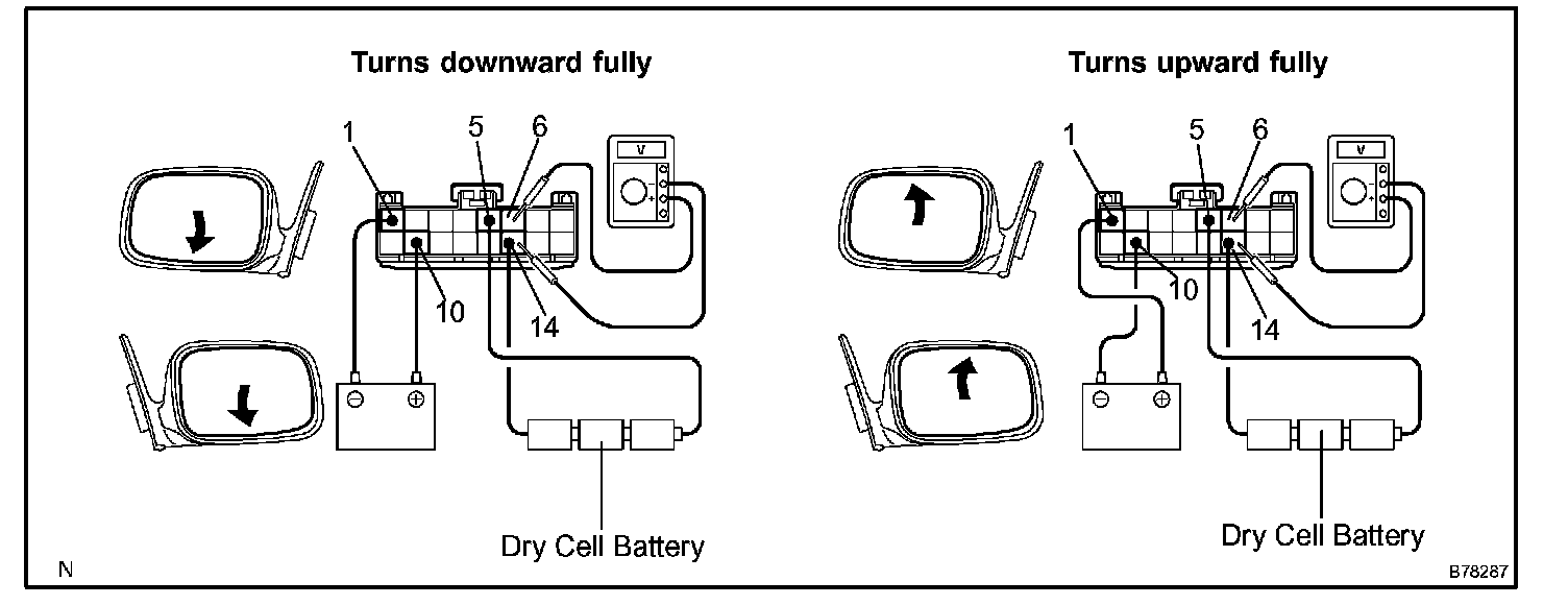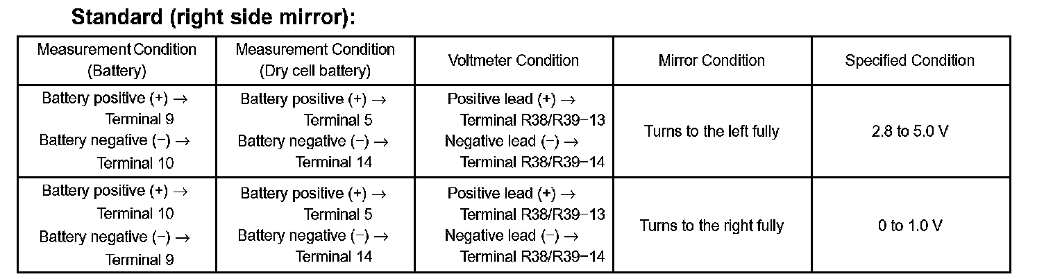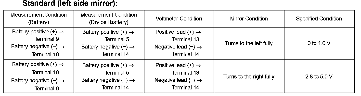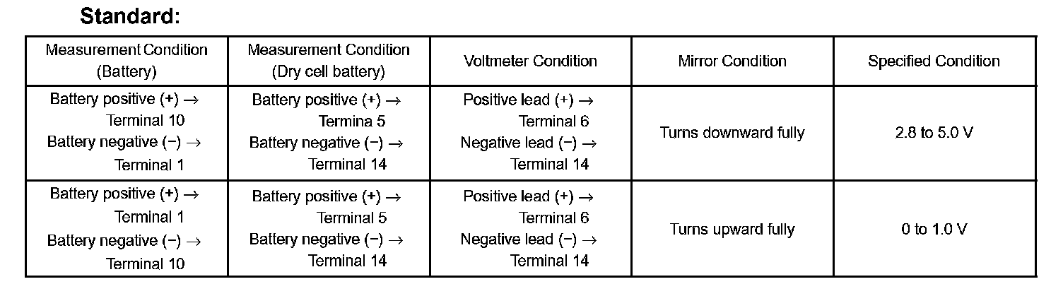 INSPECT MIRROR POSITION SENSORa. Apply voltage to the terminals with a battery and a dry cell battery, as shown in the table.