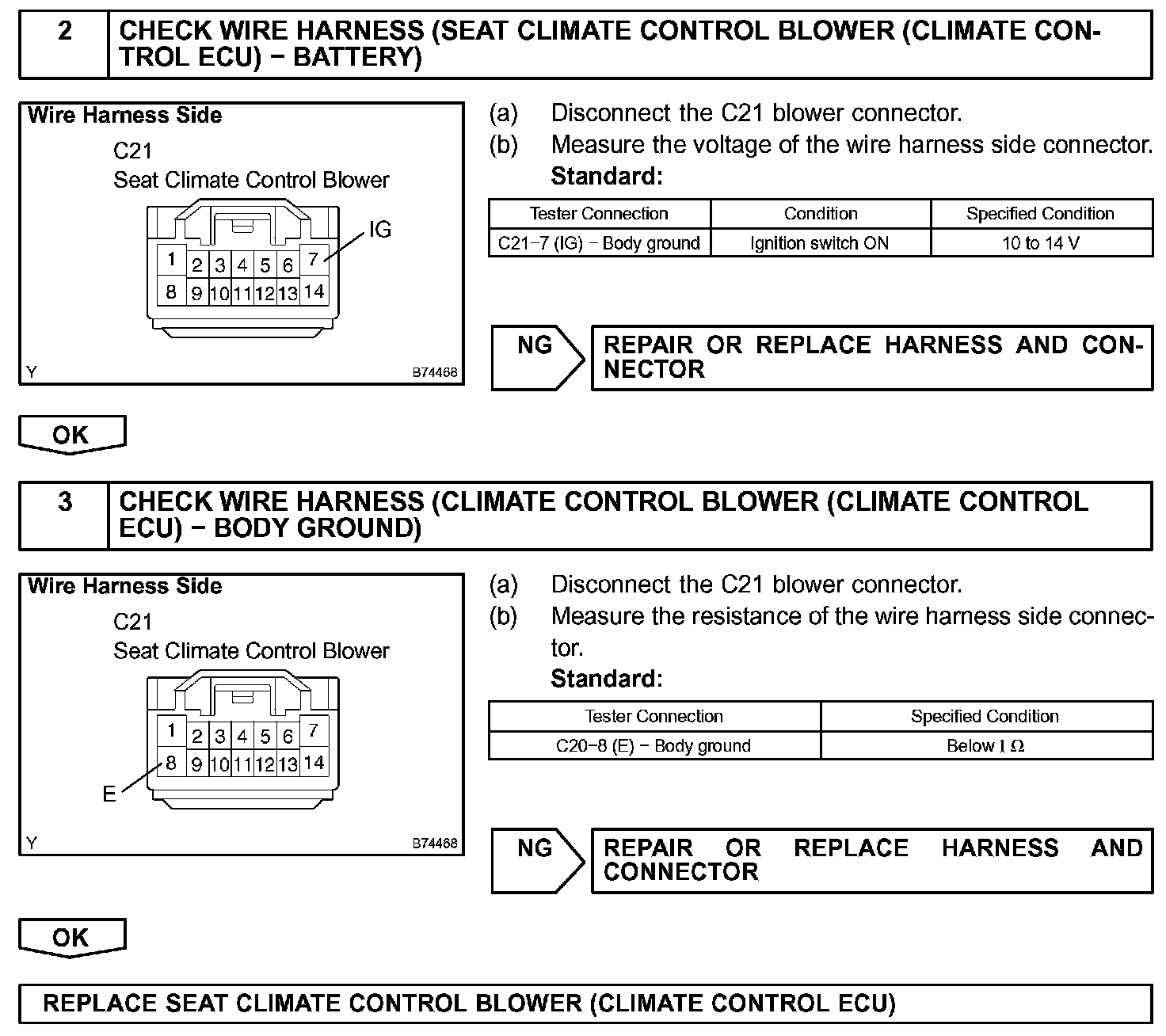 If the climate control seat does not operate, the seat climate control blower (climate control ECU) or the wire harness may be malfunctioning.