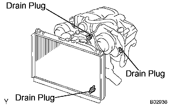 b. Loosen the radiator drain plug and 2 drain cock plugs, then drain the coolant.