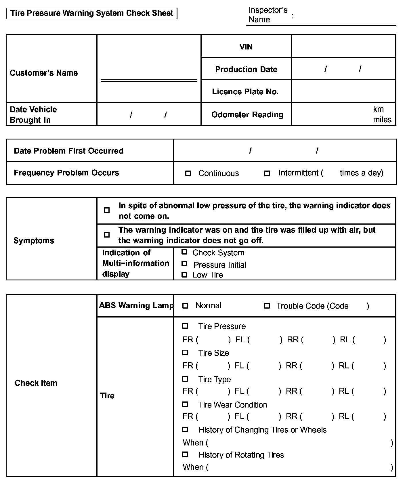 Tire Pressure Warning System Check Sheet: