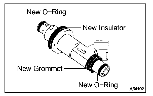 b. Check the injector's grooves (where O-rings are installed) for foreign matter or damage. Apply gasoline to 2 new O-rings and install them to the injector's grooves.