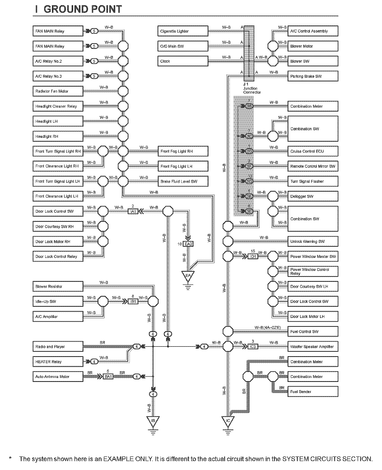 The ground points circuit diagram shows the connections from all major parts to the respective ground points. When troubleshooting a faulty ground point, checking the system circuits which use a common ground may help you identify the problem ground quickly. The relationship between ground points (EA, IB and IC shown) can also be checked this way.
