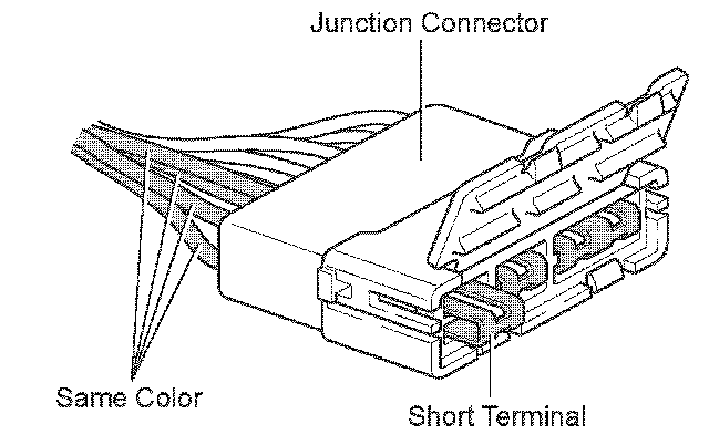 Junction connector include a short terminal which is connected to a number of wire harnesses. Always perform inspection with the short terminal installed. (When installing the wire harnesses, the harnesses can be connected to any position within the short terminal grouping. Accordingly, in other vehicles, the same position in the short terminal may be connected to a wire harness from a different part.)