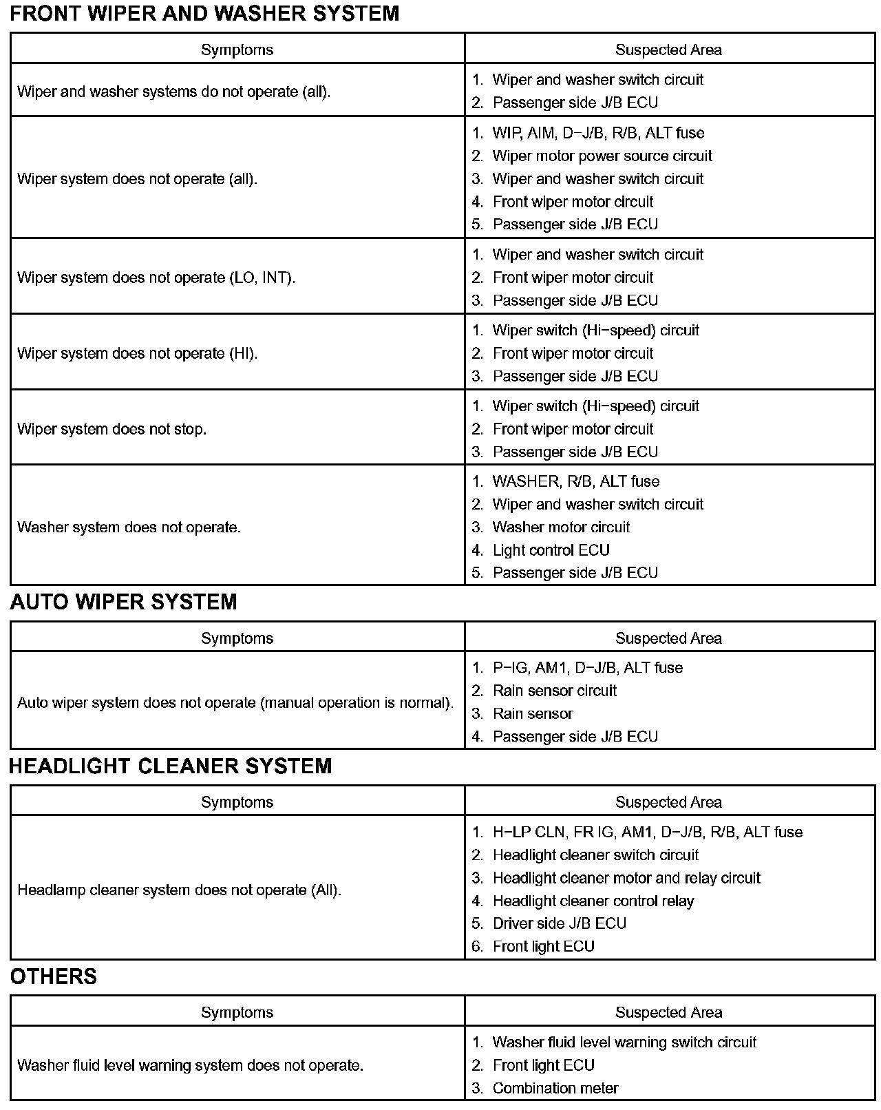 - Inspect the fuse and relay before confirming the suspected area as shown in the tables. Inspect each malfunction circuit in numerical order for the corresponding symptom.