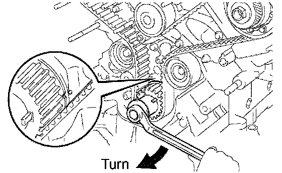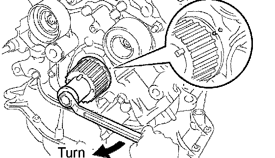 1. Using the crankshaft damper bolt, slowly turn the crankshaft timing pulley 2 revolutions from TDC to TDC.