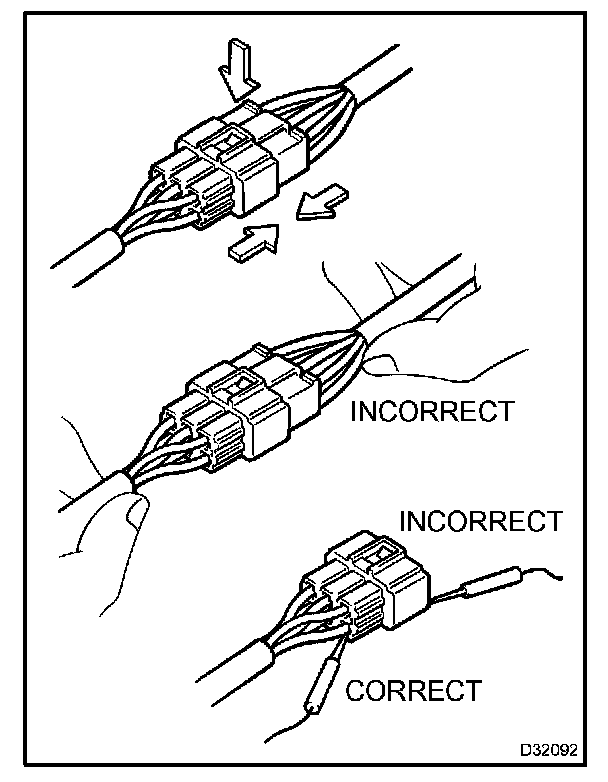 1. When disconnecting a connector, first squeeze the mating halves tightly together to release the lock, and then press the lock claw and separate the connector.