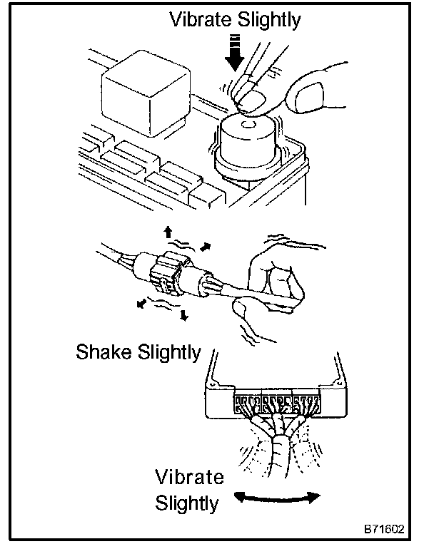 Vibration, heat or water penetration (moisture) is difficult to reproduce. The symptom simulation tests below are effective substitutes for the conditions and can be applied on a stationary vehicle. Important points in the symptom simulation test:
