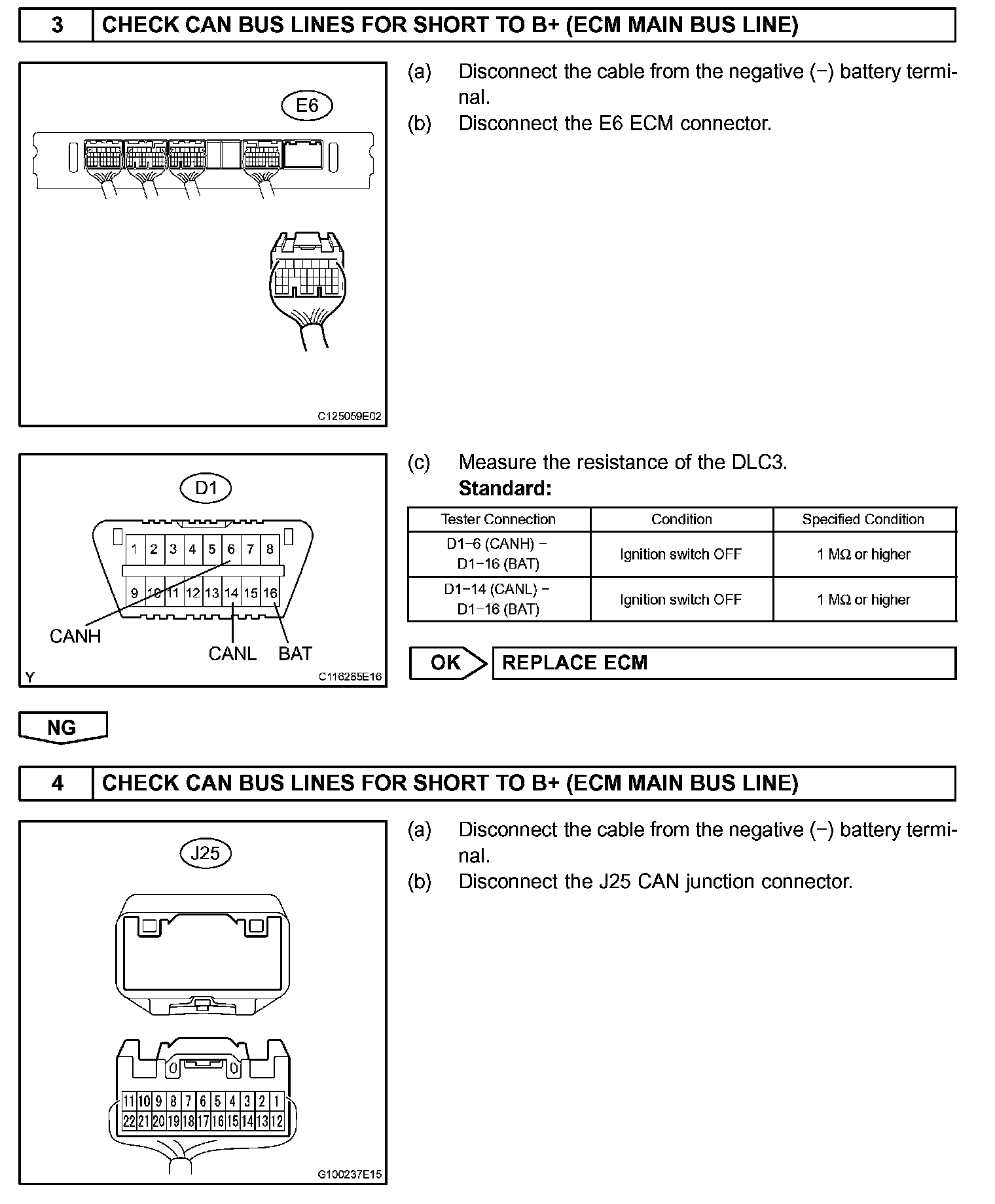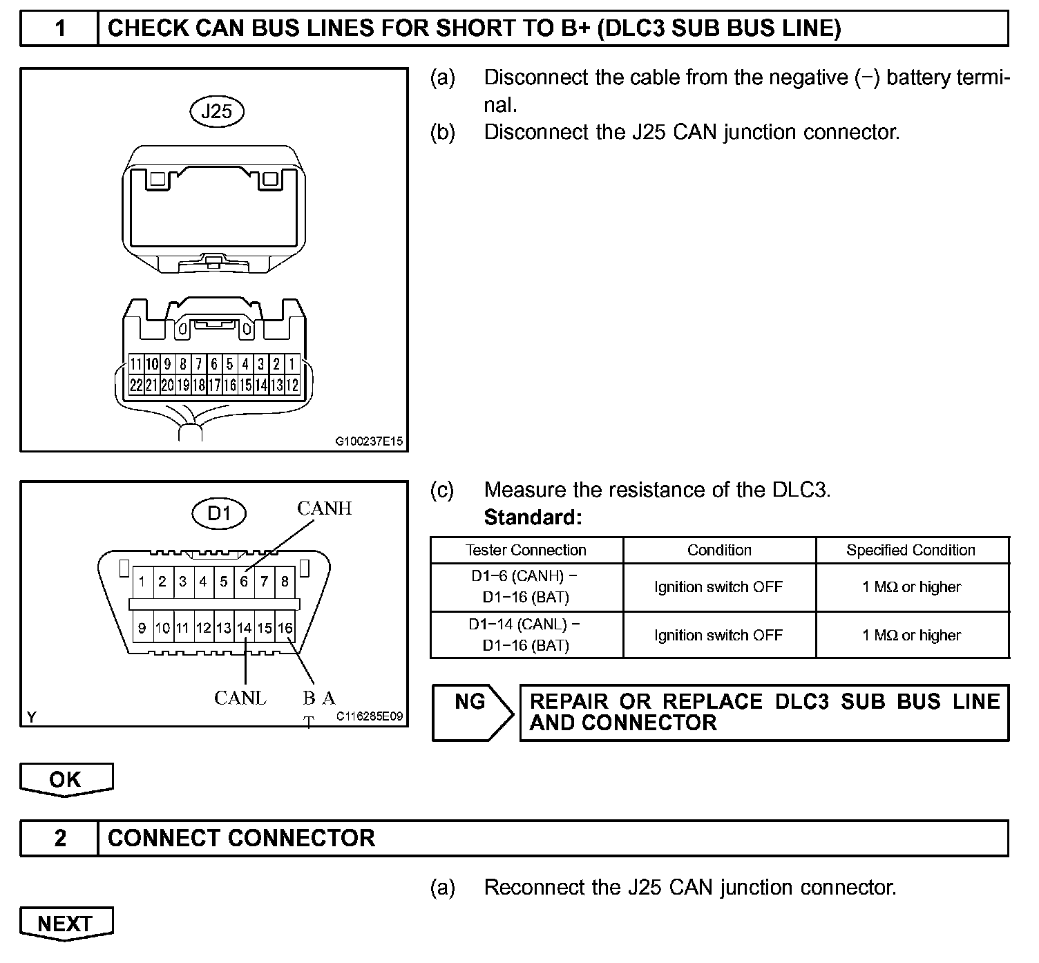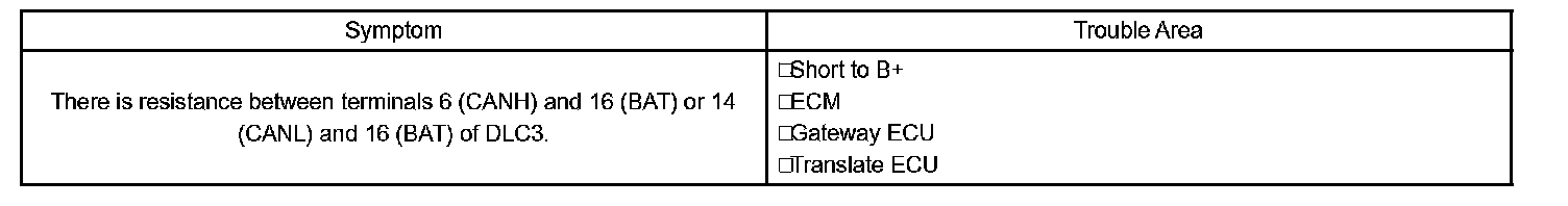 There may be a short circuit between the CAN bus line and B+ when there is resistance between terminals 6 (CANH) and 16 (BAT) or terminals 14 (CANL) and 16 (BAT) of the DLC3.