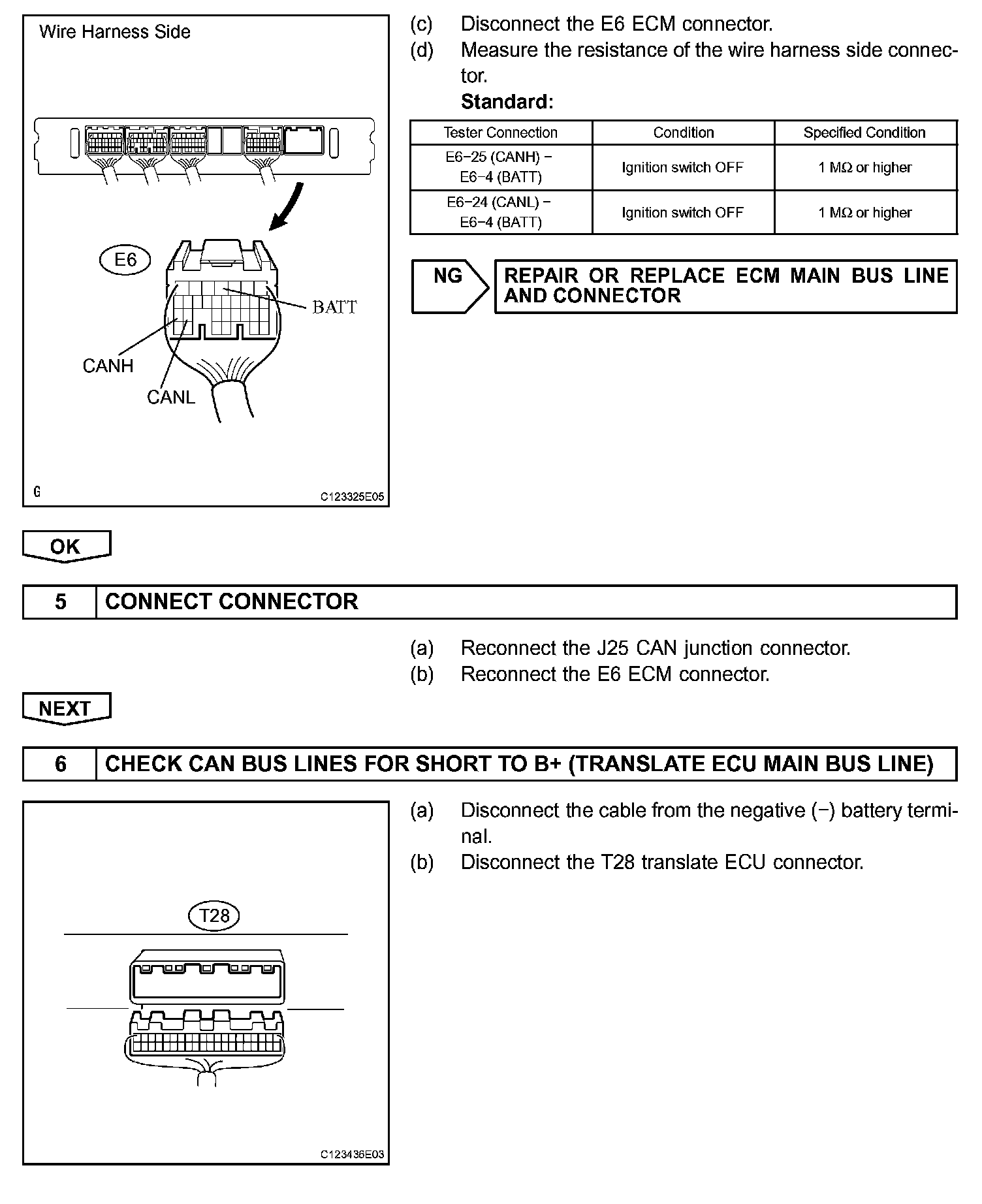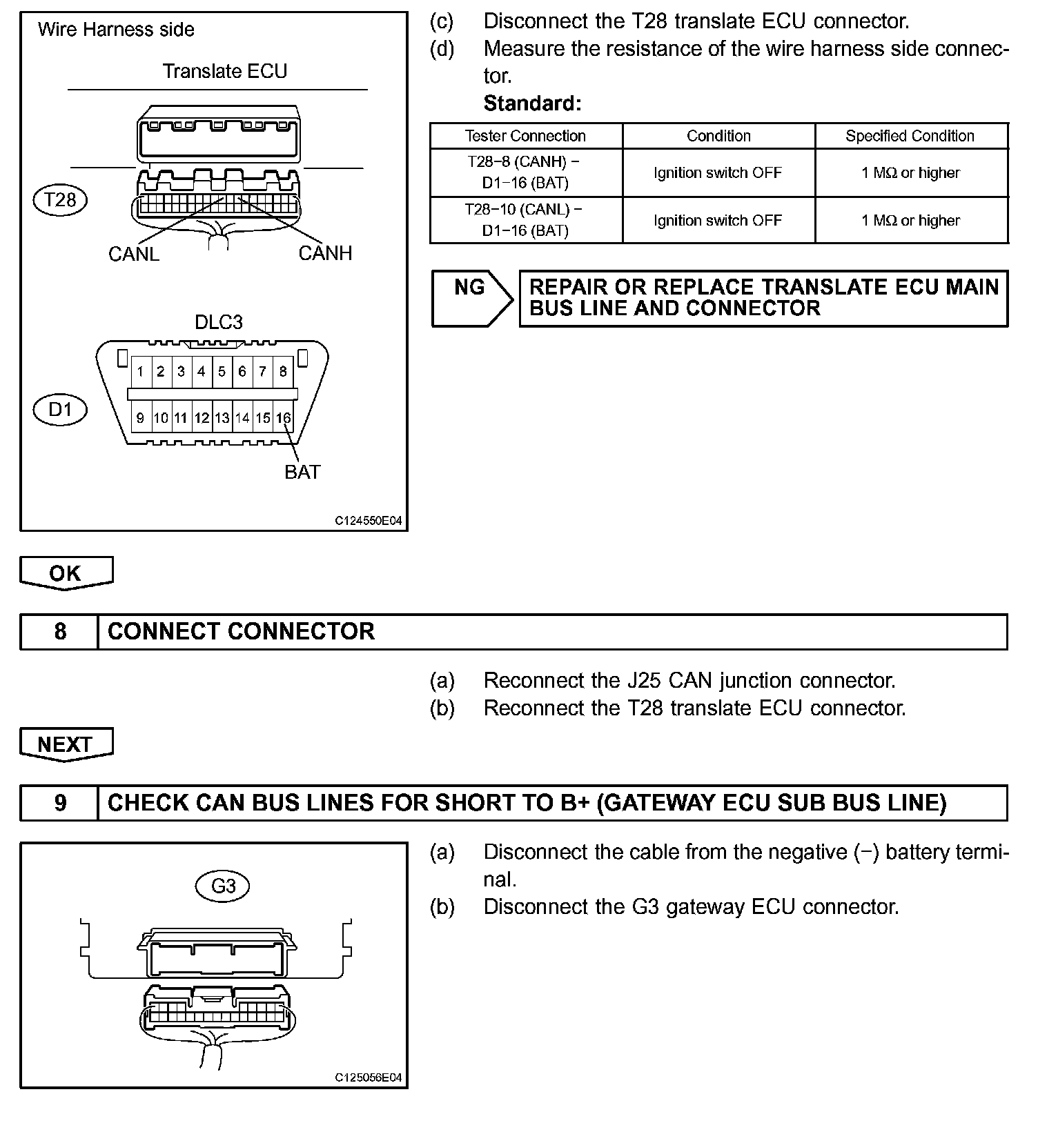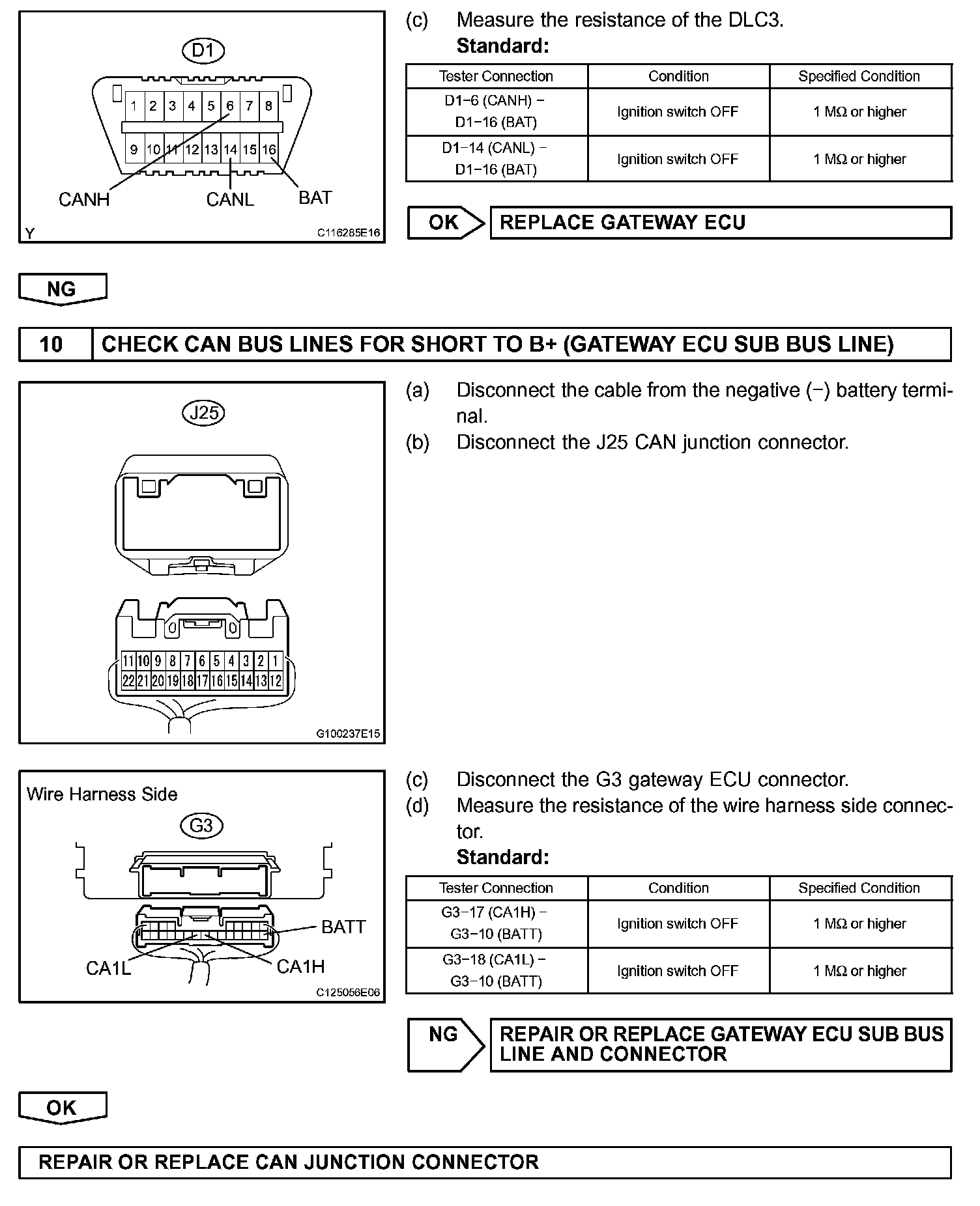 There may be a short circuit between the CAN bus line and B+ when there is resistance between terminals 6 (CANH) and 16 (BAT) or terminals 14 (CANL) and 16 (BAT) of the DLC3.