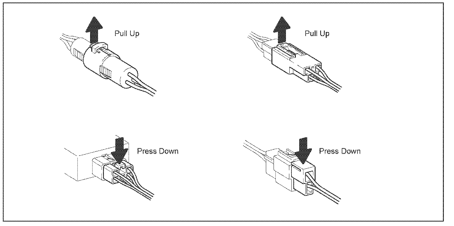 DISCONNECTION OF MALE AND FEMALE CONNECTORSTo pull apart the connectors, pull on the connector itself, not the wire harness.