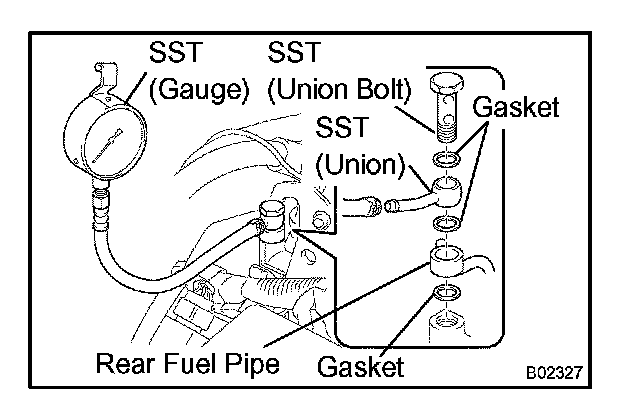 d. Install the rear fuel pipe and SST (pressure gauge) to the delivery pipe with the 3 lower gaskets and SST (union bolt).