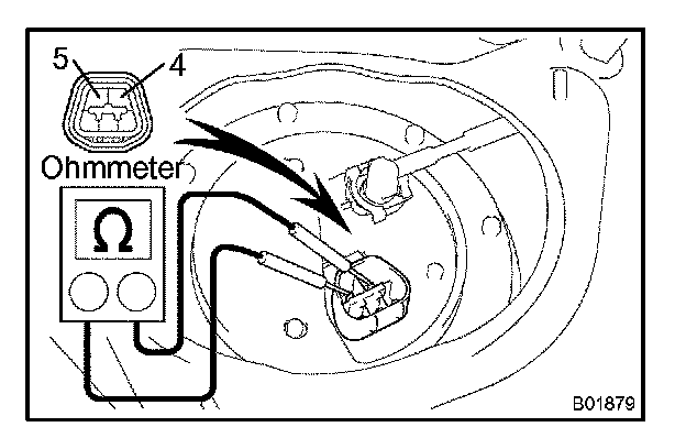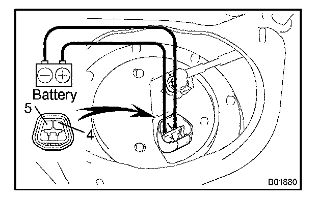 e. Inspect the operation of the fuel pump. Connect the batteries positive (+) lead to terminal 4 of the connector, and the negative (-) lead to terminal 5. Check that the fuel pump operates.