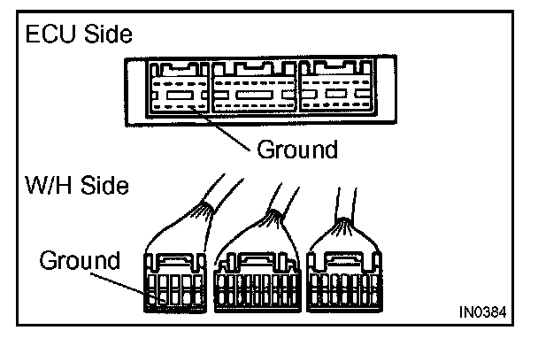 2. Disconnect the ECU connector. Check the ground terminals on the ECU side and wire harness side for evidence of bending, corrosion or foreign matter. Lastly, check the contact pressure of the female terminals.