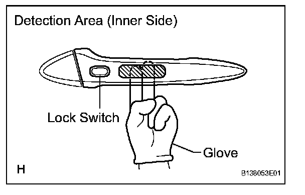 5. Step 5: Inspect the door electrical key oscillator's response sensitivity. Wear protective gloves, set the system to unlock standby mode, and check that touching the inner side of the outside handle (the highlighted area in the illustration) with your finger causes the door to unlock.