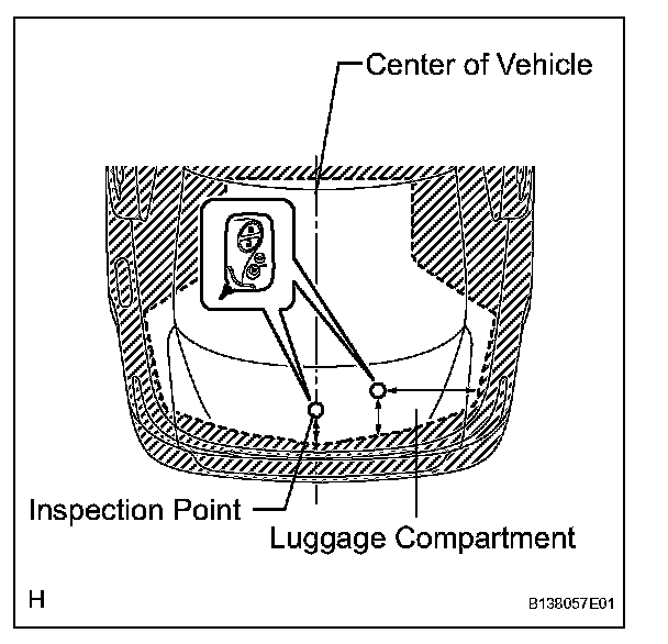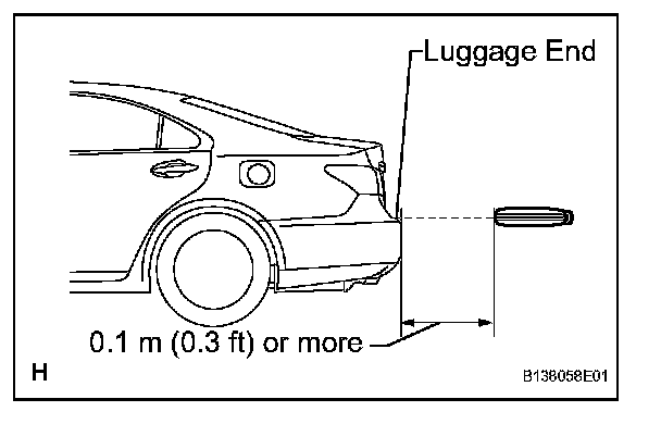 3. Inspect the electrical key lock-in prevention's detection area and the entry door control receiver for wave leaks. Hold the electrical key at the same height as the lower edge of the luggage compartment door and align the key with the center of the rear of the vehicle. Pay attention to the direction and position of the electrical key given in the illustration. When the electrical key is over 0.1 m (0.3 ft) from the vehicle's rear bumper, check that the electrical key's wireless buzzer does not sound.