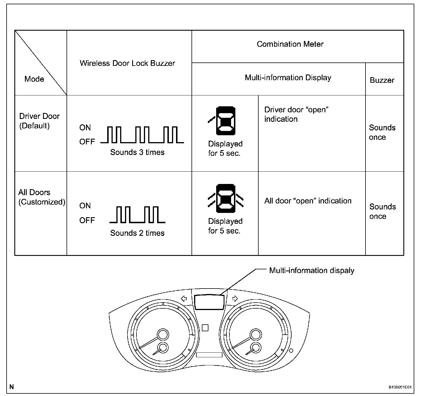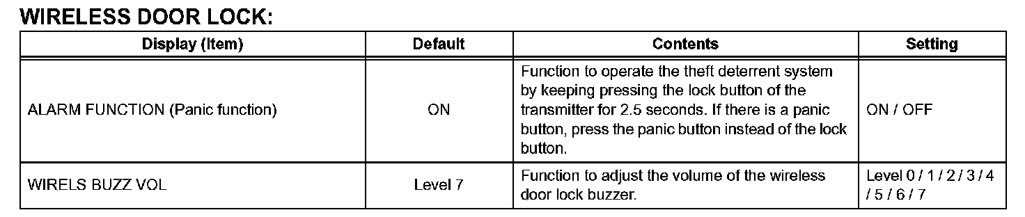 When electrical key cancel is activated, the wireless door lock buzzer sounds twice. To return to the original condition, perform the procedures again. When the original condition is returned, the wireless door lock buzzer sounds once.