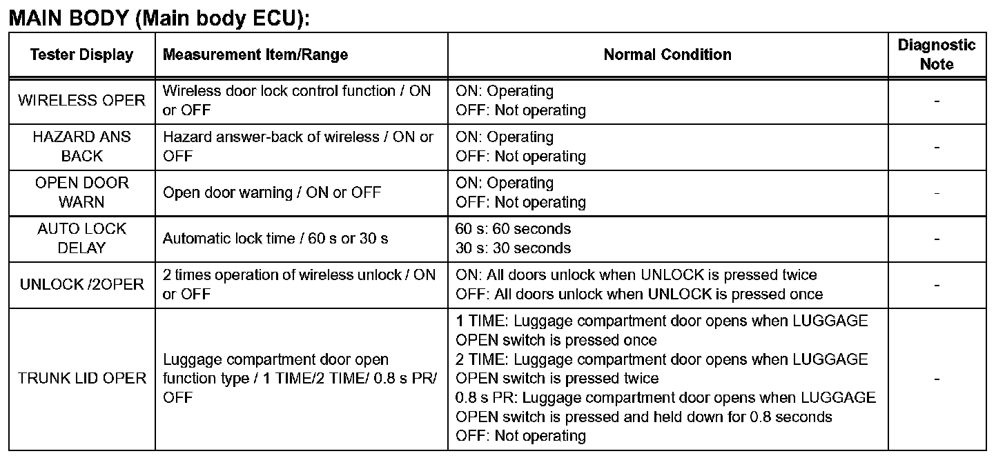 DATA LISTHINT: Using the intelligent tester DATA LIST allows switch, sensor, actuator and other item values to be read without removing any parts. Reading the DATA LIST early in troubleshooting is one way to shorten labor time.