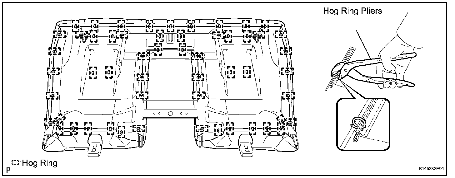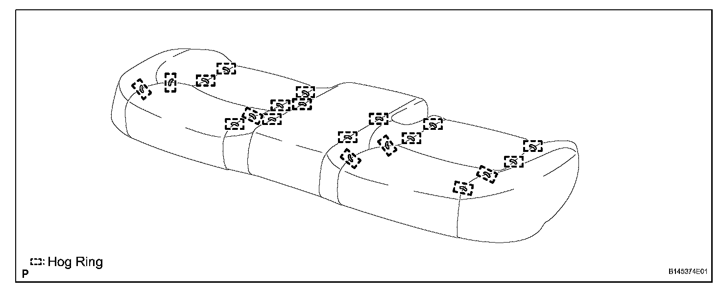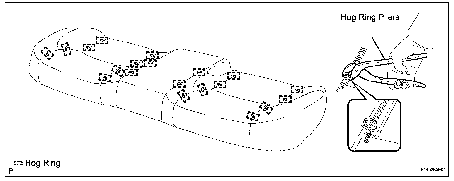 a. Using hog ring pliers, install the rear bench type seat cushion cover to the seat cushion frame (with pad) with 20 new hog rings.